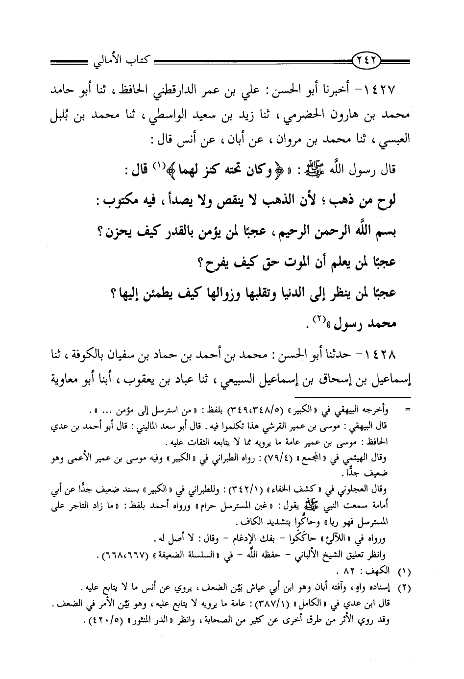 1427 - أَخْبَرَنَا أَبُو الْحَسَنِ عَلَيُّ بْنُ عُمَرَ الدَّارَقُطْنِيُّ الْحَافِظُ، ثنا أَبُو حَامِدٍ مُحَمَّدُ بْنُ هَارُونَ الْحَضْرَمِيُّ، ثنا زَيْدُ بْنُ سَعِيدٍ الْوَاسِطِيُّ، ثنا مُوسَى بْنُ بُلَيْلٌ الْعَبْسِيُّ، ثنا مُحَمَّدُ بْنُ مَرْوَانَ، عَنْ أَبَانَ، عَنْ أَنَسٍ، قَالَ: قَالَ رَسُولُ اللَّهِ صَلَّى اللَّهُ عَلَيْهِ وَسَلَّمَ: " {وَكَانَ تَحْتَهُ كَنْزٌ لَهُمَا} [الكهف: 82] قَالَ: لَوْحٌ مِنْ ذَهَبٍ؛ لأَنَّ الذَّهَبَ لَا يَنْقُصُ وَلَا يَصْدَأُ، فِيهِ مَكْتُوبٌ: بِسْمِ اللَّهِ الرَّحْمَنِ الرَّحِيمِ، عَجَبًا لِمَنْ يُؤْمِنُ بِالْقَدَرِ كَيْفَ يَحْزَنُ، عَجَبًا لِمَنْ يَعْلَمُ أَنَّ الْمَوْتَ حَقٌّ كَيْفَ يَفْرَحُ، عَجَبًا لِمَنْ يَنْظُرُ إِلَى الدُّنْيَا وَتَقَلُّبِهَا وَزَوَالِهَا كَيْفَ يَطْمَئِنُّ إِلَيْهَا، مُحَمَّدٌ رَسُولُ اللَّهِ "
