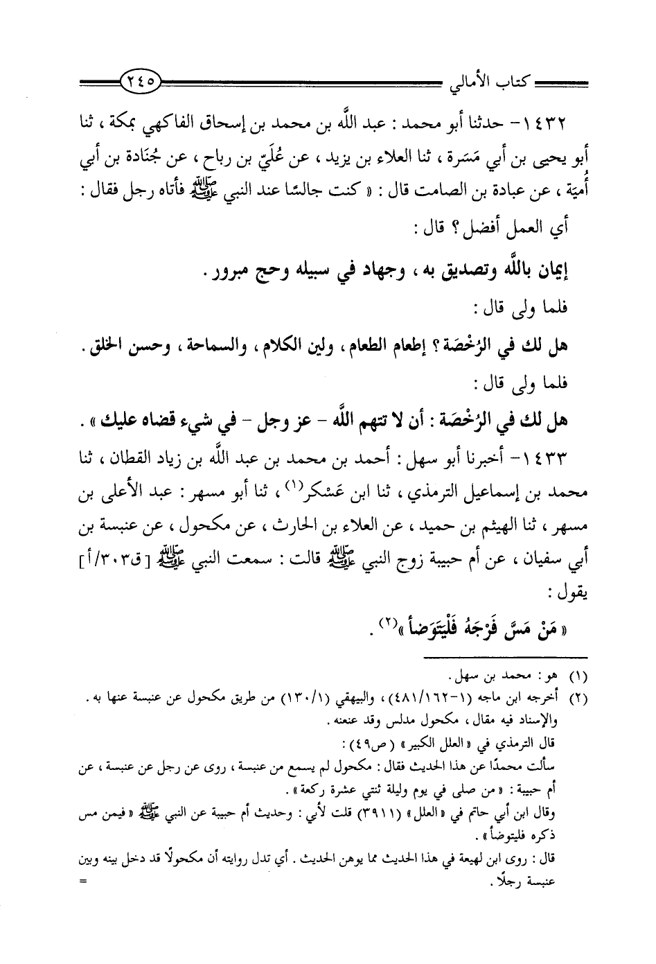 1432 - حَدَّثَنَا أَبُو مُحَمَّدٍ عَبْدُ اللَّهِ بْنُ مُحَمَّدِ بْنِ إِسْحَاقَ الْفَاكِهِيُّ , بِمَكَّةَ، ثنا أَبُو يَحْيَى بْنُ أَبِي مَسَرَّةَ، ثنا الْعَلاءُ، ثنا سُوَيْدٌ، ثنا عَيَّاشُ بْنُ عَبَّاسٍ، عَنِ الْحَارِثِ بْنِ يَزِيدَ، عَنْ عَلِيِّ بْنِ رَبَاحٍ، عَنْ جُنَادَةَ بْنِ أَبِي أُمَيَّةَ، عَنْ عُبَادَةَ بْنِ الصَّامِتِ، قَالَ: كُنْتُ جَالِسًا عِنْدَ النَّبِيِّ صَلَّى اللَّهُ عَلَيْهِ وَسَلَّمَ فَأَتَاهُ رَجُلٌ فَقَالَ: أَيُّ الْعَمَلِ أَفْضَلُ؟ قَالَ: «الْإِيمَانُ بِاللَّهِ وَتَصْدِيقٌ بِهِ وَجِهَادٌ فِي سَبِيلِهِ وَحَجٌّ مَبْرُورٌ» .