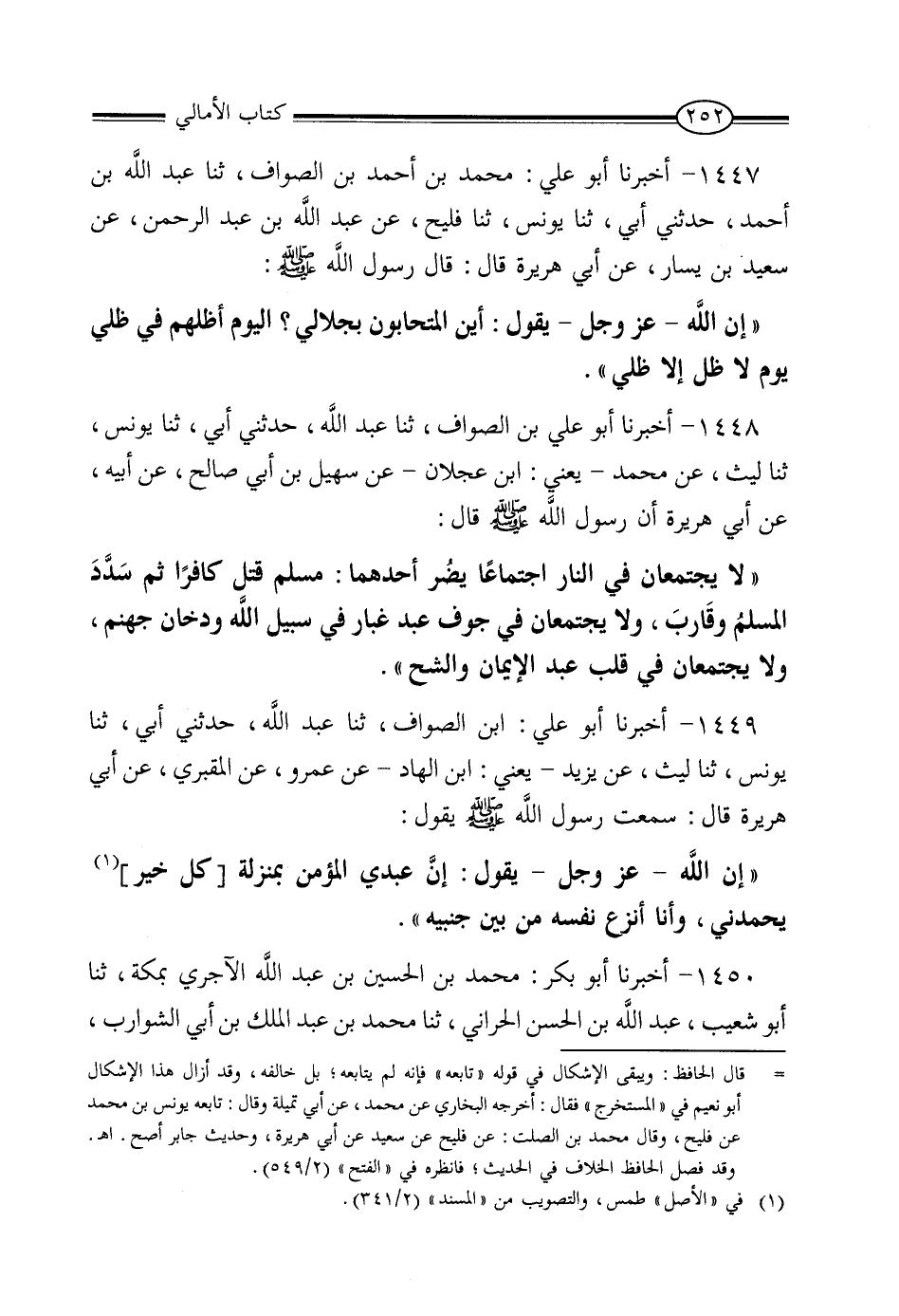 1447 - أَخْبَرَنَا أَبُو عَلِيٍّ مُحَمَّدُ بْنُ أَحْمَدَ بْنِ الصَّوَّافِ، ثنا عَبْدُ اللَّهِ بْنُ أَحْمَدَ، حَدَّثَنِي أَبِي، ثنا يُونُسُ، ثنا فُلَيْحٌ , عَنْ عَبْدِ اللَّهِ بْنِ عَبْدِ الرَّحْمَنِ، عَنْ سَعِيدِ بْنِ يَسَارٍ، عَنْ أَبِي هُرَيْرَةَ، قَالَ: قَالَ رَسُولُ اللَّهِ صَلَّى اللَّهُ عَلَيْهِ وَسَلَّمَ: إِنَّ اللَّهَ عَزَّ وَجَلَّ يَقُولُ: «أَيْنَ الْمُتَحَابُّونَ بِجَلالِي , الْيَوْمَ أُظِلُّهُمْ فِي ظِلِّي يَوْمَ لَا ظِلَّ إِلا ظِلِّي»