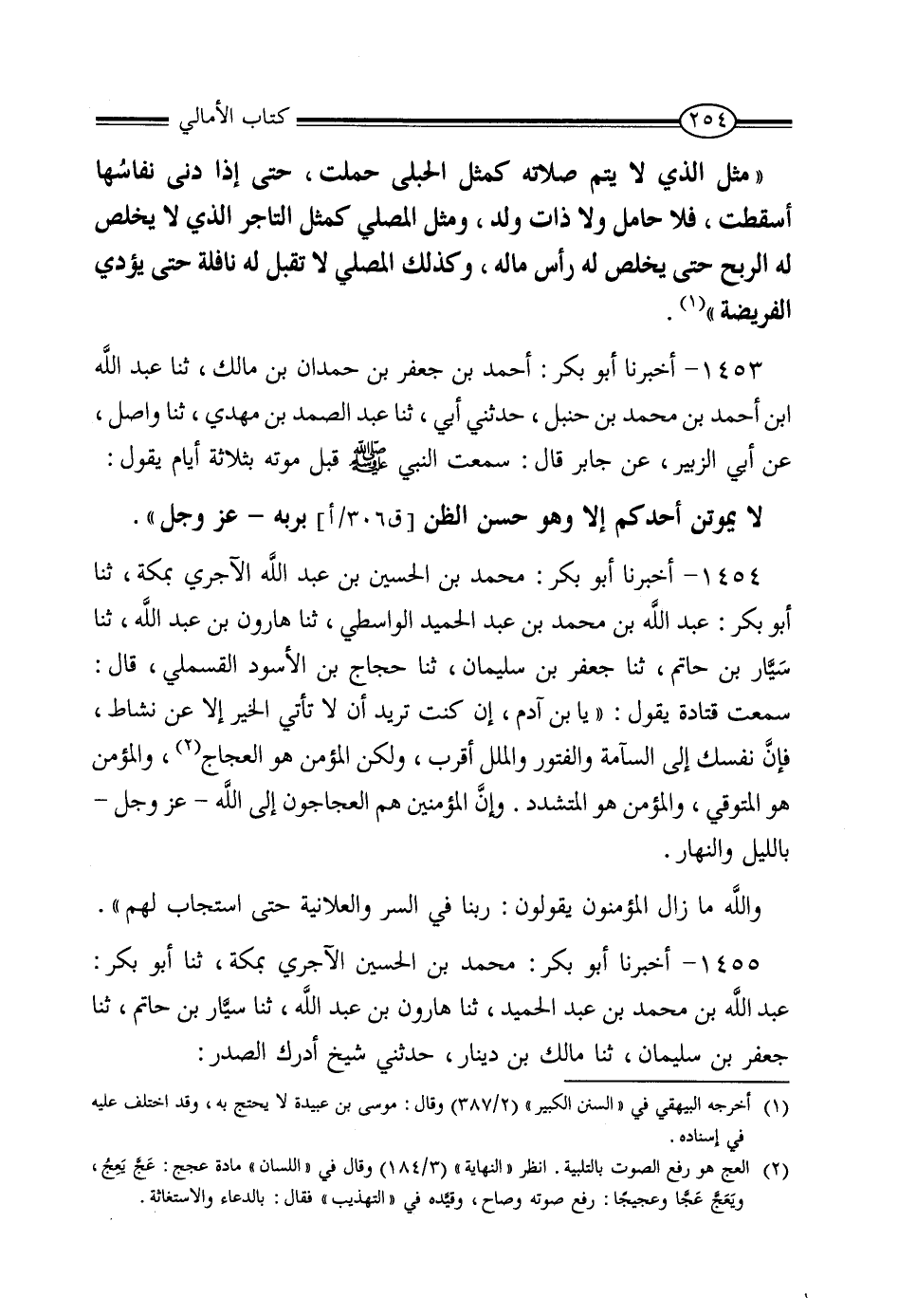 1454 - أَخْبَرَنَا أَبُو بَكْرٍ مُحَمَّدُ بْنُ الْحُسَيْنِ بْنِ عَبْدِ اللَّهِ الآجُرِيُّ , بِمَكَّةَ، أنبا أَبُو بَكْرٍ عَبْدُ اللَّهِ بْنُ مُحَمَّدِ بْنِ عَبْدِ الْحَمِيدِ الْوَاسِطِيُّ، ثنا هَارُونُ بْنُ عَبْدِ اللَّهِ، ثنا سَيَّارُ بْنُ حَاتِمٍ، ثنا جَعْفَرُ بْنُ سُلَيْمَانَ، عَنْ حَجَّاجِ بْنِ الأَسْوَدِ الْقَسْمَلِيِّ، قَالَ: سَمِعْتُ قَتَادَةَ , يَقُولُ: " يَا ابْنَ آدَمَ إِنْ كُنْتَ تُرِيدُ أَنْ لَا تَأْتِيَ الْخَيْرَ إِلا عَنْ نَشَاطٍ، فَإِنَّ نَفْسَكَ إِلَى السَّآمَةِ وَالْفُتُورِ وَالْمَلَلِ أَقْرَبُ، وَلَكِنَّ الْمُؤْمِنَ هُوَ الْعَجَّاجُ , وَالْمُؤْمِنُ هُوَ الْمُتَوَقِّي , وَالْمُؤْمِنُ هُوَ الْمُتَشَدِّدُ , وَإِنَّ الْمُؤْمِنِينَ هُمُ الْعَجَّاجُونَ إِلَى اللَّهِ عَزَّ وَجَلَّ بِاللَّيْلِ وَالنَّهَارِ , وَاللَّهِ مَا زَالَ الْمُؤْمِنُونَ يَقُولُونَ: رَبَّنَا , فِي السِّرِّ وَالْعَلانِيَةِ حَتَّى اسْتَجَابَ لَهُمْ "