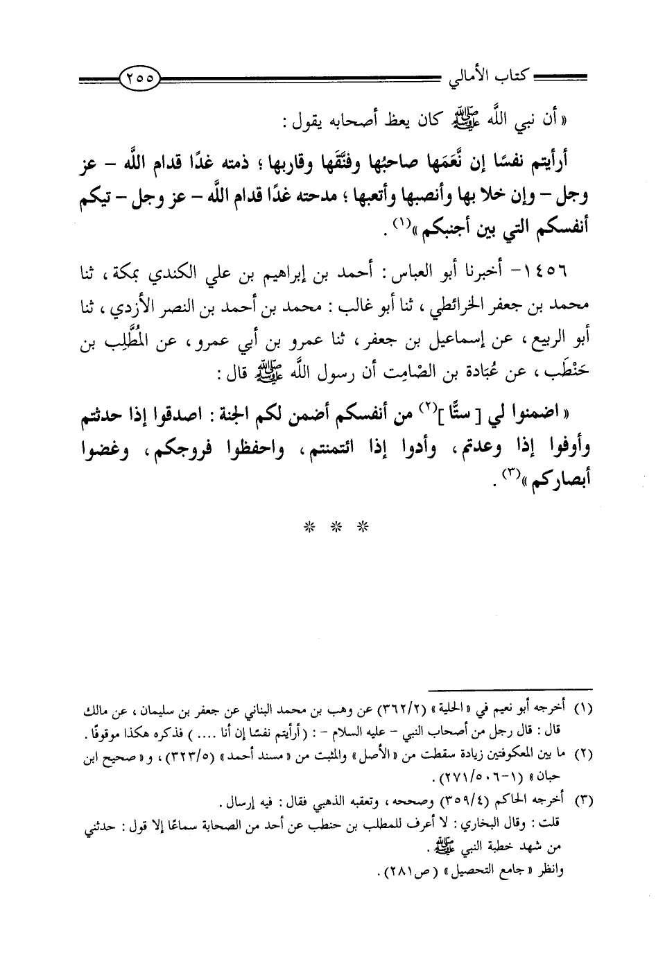 1456 - أَخْبَرَنَا أَبُو الْعَبَّاسِ أَحْمَدُ بْنُ إِبْرَاهِيمَ بْنِ عَلِيٍّ الْكِنْدِيُّ , بِمَكَّةَ، نا مُحَمَّدُ بْنُ جَعْفَرٍ الْخَرَائِطِيُّ، ثنا أَبُو غَالِبٍ مُحَمَّدُ بْنُ أَحْمَدَ بْنِ النَّضْرِ الأَزْدِيُّ، ثنا أَبُو الرَّبِيعِ، عَنْ إِسْمَاعِيلَ بْنِ جَعْفَرٍ، ثنا عَمْرُو بْنُ أَبِي عَمْرٍو، عَنِ الْمُطَّلِبِ بْنِ حَنْطَبٍ، عَنْ عُبَادَةَ بْنِ الصَّامِتِ , أَنّ رَسُولَ اللَّهِ صَلَّى اللَّهُ عَلَيْهِ وَسَلَّمَ , قَالَ: " اضْمَنُوا لِي مِنْ أَنْفُسِكُمْ أَضْمَنُ لَكُمُ الْجَنَّةَ: اصْدُقُوا إِذَا حَدَّثْتُمْ , وَأَوْفُوا إِذَا نَذَرْتُمْ , وَأَدُّوا إِذَا ائْتُمِنْتُمْ , وَاحْفَظُوا فُرُوجَكُمْ , وَغُضُّوا أَبْصَارَكُمْ "