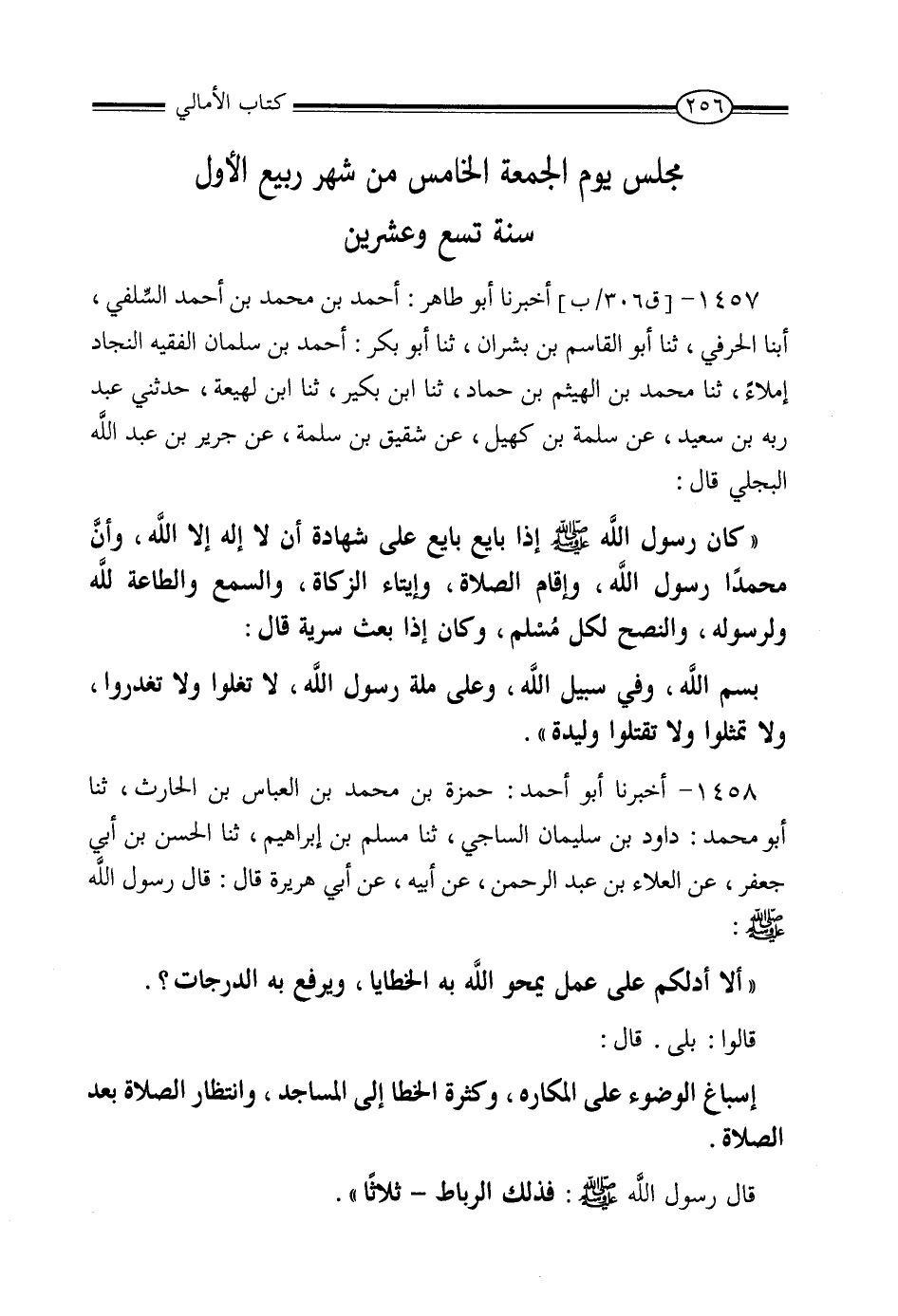 1457 - أَخْبَرَنَا أَبُو طَاهِرٍ أَحْمَدُ بْنُ مُحَمَّدِ بْنِ أَحْمَدَ السِّلَفِيُّ، أنبا الْخَرَقِيُّ، ثنا أَبُو الْقَاسِمِ بْنُ بِشْرَانَ، ثنا أَبُو بَكْرٍ أَحْمَدُ بْنُ سَلْمَانَ الْفَقِيهُ النَّجَّادُ , إِمْلاءً، ثنا مُحَمَّدُ بْنُ الْهَيْثَمِ بْنِ حَمَّادٍ، ثنا ابْنُ بُكَيْرٍ، ثنا ابْنُ لَهِيعَةَ , حَدَّثَنِي عَبْدُ رَبِّهِ بْنُ سَعِيدٍ , عَنْ سَلَمَةَ بْنِ كُهَيْلٍ، عَنْ شَقِيقِ بْنِ سَلَمَةَ، عَنْ جَرِيرِ بْنِ عَبْدِ اللَّهِ الْبَجَلِيِّ، قَالَ: كَانَ رَسُولُ اللَّهِ صَلَّى اللَّهُ عَلَيْهِ وَسَلَّمَ إِذَا بَايَعَ بَايَعَ عَلَى شَهَادَةِ أَنْ لَا إِلَهَ إِلا اللَّهُ وَأَنَّ مُحَمَّدًا رَسُولُ اللَّهِ , وَإِقَامِ الصَّلاةِ , وَإِيتَاءِ الزَّكَاةِ، وَالسَّمْعِ وَالطَّاعَةِ لِلَّهِ وَلِرَسُولِهِ وَالنُّصْحِ لِكُلِّ مُسْلِمٍ , وَكَانَ إِذَا بَعَثَ سَرِيَّةً قَالَ: «بِسْمِ اللَّهِ وَفِي سَبِيلِ اللَّهِ وَعَلَى مِلَّةِ رَسُولِ اللَّهِ، لَا تَغْلُوا وَلَا تَغْدُرُوا وَلَا تُمَثِّلُوا وَلا تَقْتُلُوا الْوِلْدَانَ»