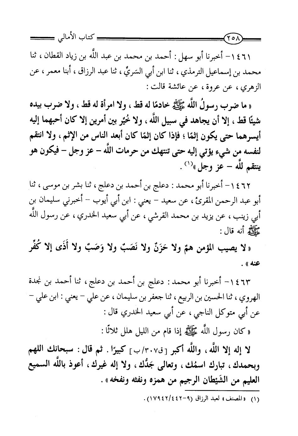 1461 - أَخْبَرَنَا أَبُو سَهْلٍ أَحْمَدُ بْنُ مُحَمَّدِ بْنِ عَبْدِ اللَّهِ بْنِ زِيَادٍ الْقَطَّانُ، ثنا مُحَمَّدُ بْنُ إِسْمَاعِيلَ التِّرْمِذِيُّ، ثنا ابْنُ أَبِي السَّرِيِّ، ثنا عَبْدُ الرَّزَّاقِ، أنبا مَعْمَرٌ، عَنِ الزُّهْرِيِّ، عَنْ عُرْوَةَ، عَنْ عَائِشَةَ، قَالَتْ: «مَا ضَرَبَ رَسُولُ اللَّهِ صَلَّى اللَّهُ عَلَيْهِ وَسَلَّمَ خَادِمًا لَهُ قَطُّ وَلَا امْرَأَةً لَهُ قَطُّ , وَلَا ضَرَبَ بِيَدِهِ شَيْئًا قَطُّ، إِلا أَنْ يُجَاهِدَ فِي سَبِيلِ اللَّهِ، وَلَا خُيِّرَ بَيْنَ أَمْرَيْنِ قَطُّ إِلا كَانَ أَحَبُّهُمَا إِلَيْهِ أَيْسَرَهُمَا حَتَّى يَكُونَ إِثْمًا، فَإِذَا كَانَ إِثْمًا كَانَ أَبْعَدَ النَّاسِ مِنَ الإِثْمِ، وَلَا انْتَقَمَ لِنَفْسِهِ مِنْ شَيْءٍ يُؤْتَى إِلَيْهِ حَتَّى تُنْتَهَكَ مِنْ حُرُمَاتِ اللَّهِ عَزَّ وَجَلَّ فَيَكُونَ هُوَ يَنْتَقِمُ لِلَّهِ عَزَّ وَجَلَّ»