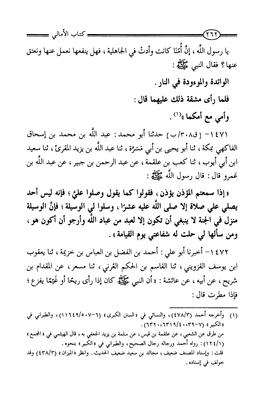 1472 - أَخْبَرَنَا أَبُو عَلِيٍّ أَحْمَدُ بْنُ الْفَضْلِ بْنِ الْعَبَّاسِ بْنِ خُزَيْمَةَ، ثنا يَعْقُوبُ بْنُ يُوسُفَ الْقَزْوِينِيُّ، ثنا الْقَاسِمُ بْنُ الْحَكَمِ الْعُرَنِيُّ، ثنا مِسْعَرٌ، عَنِ الْمِقْدَامِ بْنِ شُرَيْحٍ، عَنْ أَبِيهِ، عَنْ عَائِشَةَ , أَنّ النَّبِيَّ صَلَّى اللَّهُ عَلَيْهِ وَسَلَّمَ كَانَ إِذَا رَأَى رِيحًا أَوْ غَيْمًا يَفْزَعُ , فَإِذَا أَمْطَرَتْ قَالَ: