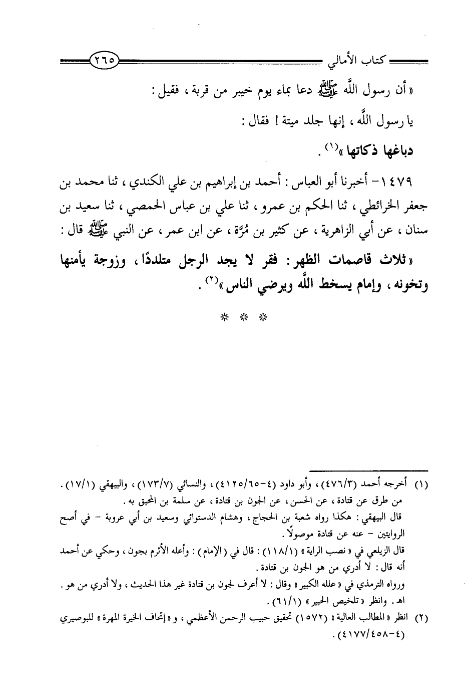 1479 - أَخْبَرَنَا أَبُو الْعَبَّاسِ أَحْمَدُ بْنُ إِبْرَاهِيمَ بْنِ عَلِيٍّ الْكِنْدِيُّ، ثنا مُحَمَّدُ بْنُ جَعْفَرٍ الْخَرَائِطِيُّ، ثنا الْحَكَمُ بْنُ عَمْرٍو، ثنا عَلِيُّ بْنُ عَيَّاشٍ الْحِمْصِيُّ، ثنا سَعِيدُ بْنُ سِنَانٍ، عَنْ أَبِي الزَّاهِرِيَّةِ، عَنْ كَثِيرِ بْنِ مُرَّةَ، عَنِ ابْنِ عُمَرَ، عَنِ النَّبِيِّ صَلَّى اللَّهُ عَلَيْهِ وَسَلَّمَ , قَالَ: " ثَلاثٌ قَاصِمَاتُ الظَّهْرِ: فَقْرٌ لَا يَجِدُ الرَّجُلُ مُتَلَذَّذًا، وَزَوْجَةٌ يَأْمَنُهَا وَتَخُونُهُ، وَإِمَامٌ يُسْخِطُ اللَّهَ وَيُرْضِي النَّاسَ "