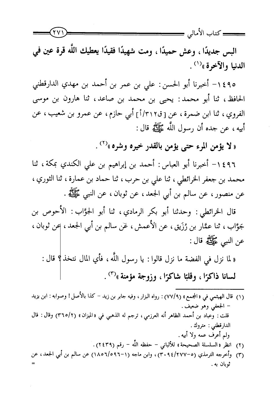 1495 - أَخْبَرَنَا أَبُو الْحَسَنِ عَلِيُّ بْنُ عُمَرَ بْنِ أَحْمَدَ بْنِ مَهْدِيٍّ الدَّارَقُطْنِيُّ الْحَافِظُ، نا أَبُو مُحَمَّدٍ يَحْيَى بْنُ مُحَمَّدِ بْنِ صَاعِدٍ، ثنا هَارُونُ بْنُ مُوسَى الْفَرَوِيُّ، ثنا أَبُو ضَمْرَةَ، عَنْ أَبِي حَازِمٍ، عَنْ عَمْرِو بْنِ شُعَيْبٍ، عَنْ أَبِيهِ، عَنْ جَدِّهِ , أَنّ رَسُولَ اللَّهِ صَلَّى اللَّهُ عَلَيْهِ وَسَلَّمَ , قَالَ: «لَا يُؤْمِنُ الْمَرْءُ حَتَّى يُؤْمِنَ بِالْقَدَرِ خَيْرِهِ وَشَرِّهِ»