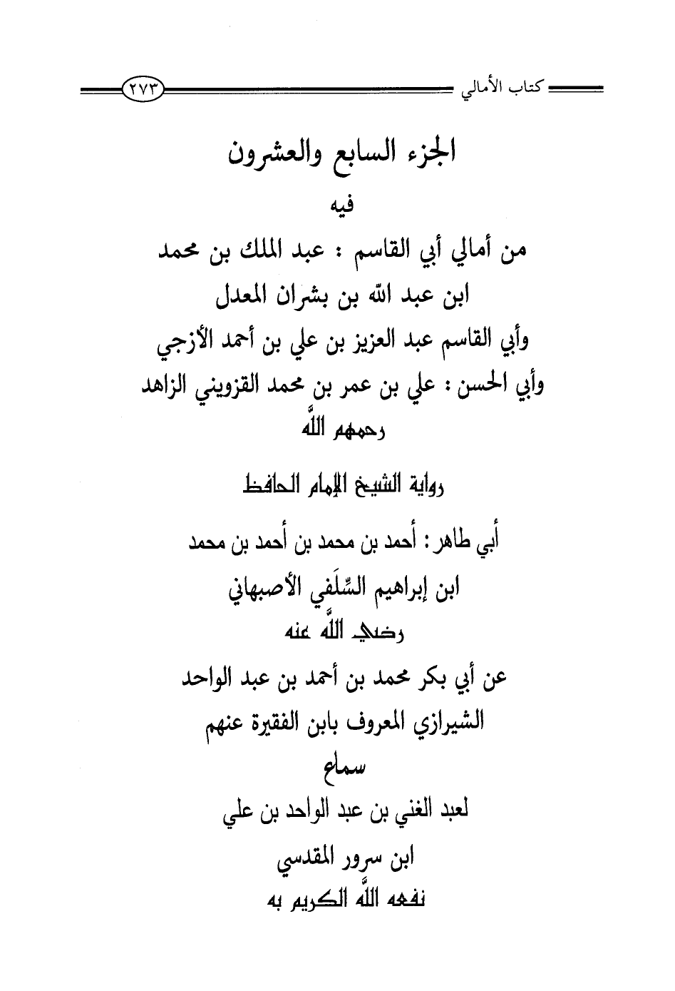 الْجُزْءُ السَّابِعُ وَالْعِشْرُونَ فِيهِ مِنْ أَمَالِي أَبِي الْقَاسِمِ عَبْدِ الْمَلِكِ بْنِ مُحَمَّدِ بْنِ عَبْدِ اللَّهِ بْنِ بِشْرَانَ الْمُعَدَّلُ , وَأَبِي الْقَاسِمِ عَبْدِ الْعَزِيزِ بْنِ عَلِيِّ بْنِ أَحْمَدَ الأَزْجِيِّ، وَأَبِي الْحَسَنِ عَلِيِّ بْنِ عُمَرَ بْنِ مُحَمَّدٍ الْقَزْوِينِيِّ الزَّاهِدِ رَحِمَهُمُ اللَّهُ.