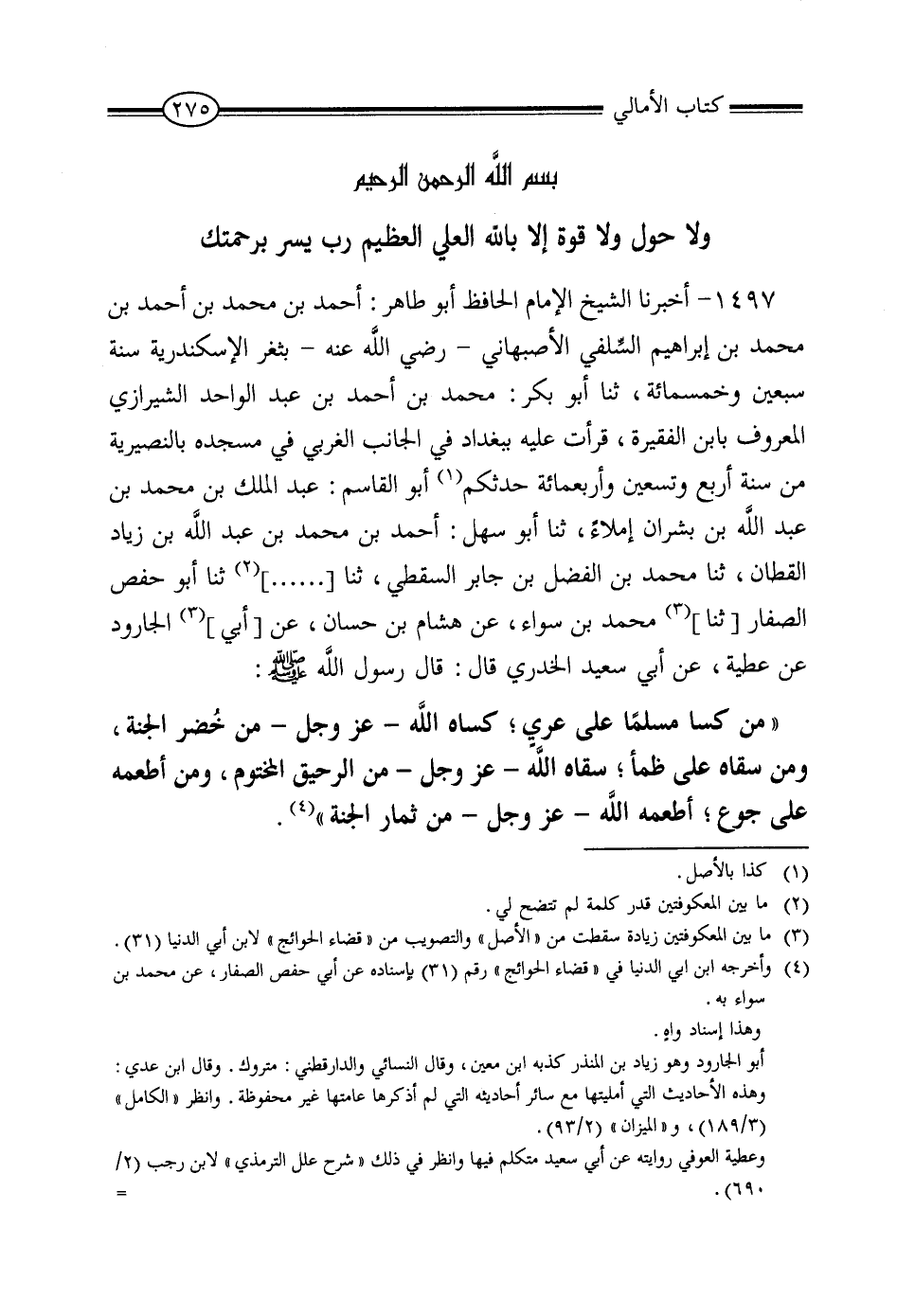 1497 - أَخْبَرَنَا الشَّيْخُ الإِمَامُ الْحَافِظُ أَبُو طَاهِرٍ أَحْمَدُ بْنُ مُحَمَّدِ بْنِ أَحْمَدَ بْنِ مُحَمَّدِ بْنِ إِبْرَاهِيمَ السَّلَفِيُّ الأَصْبَهَانِيُّ رَضِيَ اللَّهُ عَنْهُ، بِثَغْرِ الإِسْكَنْدَرِيَّةِ سَنَةَ سَبْعِينَ وَخَمْسِ مِائَةٍ، أنبا أَبُو بَكْرٍ مُحَمَّدُ بْنِ أَحْمَدَ بْنِ عَبْدِ الْوَاحِدِ الشِّيرَازِيُّ الْمَعْرُوفُ بِابْنِ الْفَقِيرَةِ، قَرَأْتُ عَلَيْهِ بِبَغْدَادَ فِي الْجَانِبِ الْغَرْبِيِّ بِمَسْجِدِهِ بِالنَّصْرِيَّةِ، فِي صَفَرَ مِنْ سَنَةَ أَرْبَعٍ وَتِسْعِينَ وَأَرْبَعِ مِائَةٍ، حَدَّثَكُمْ أَبُو الْقَاسِمِ عَبْدُ الْمَلِكِ بْنُ مُحَمَّدِ بْنِ عَبْدِ اللَّهِ بْنِ بِشْرَانَ، إِمْلاءً، ثنا أَبُو سَهْلٍ أَحْمَدُ بْنُ مُحَمَّدِ بْنِ عَبْدِ اللَّهِ بْنِ زِيَادٍ الْقَطَّانُ، ثنا مُحَمَّدُ بْنُ الْفَضْلِ بْنِ جَابِرٍ السَّقَطِيُّ، ثنا أَحْمَدُ بْنُ مُحَمَّدٍ أَبُو حَفْصٍ الصَّفَّارُ، ثنا مُحَمَّدُ بْنُ سَوَاءٍ، عَنْ هِشَامِ بْنِ حَسَّانٍ، عَنِ الْجَارُودِ، عَنْ عَطِيَّةَ، عَنْ أَبِي سَعِيدٍ الْخُدْرِيِّ، قَالَ: قَالَ رَسُولُ اللَّهِ صَلَّى اللَّهُ عَلَيْهِ وَسَلَّمَ: «مَنْ كَسَا مُسْلِمًا عَلَى عُرْيٍ كَسَاهُ اللَّهُ عَزَّ وَجَلَّ مِنْ خُضْرِ الْجَنَّةِ، وَمَنْ سَقَاهُ عَلَى ظَمَأٍ سَقَاهُ اللَّهُ عَزَّ وَجَلَّ مِنَ الرَّحِيقِ الْمَخْتُومِ، وَمَنْ أَطْعَمَهُ عَلَى جُوعٍ أَطْعَمَهُ اللَّهُ عَزَّ وَجَلَّ مِنْ ثِمَارِ الْجَنَّةِ»