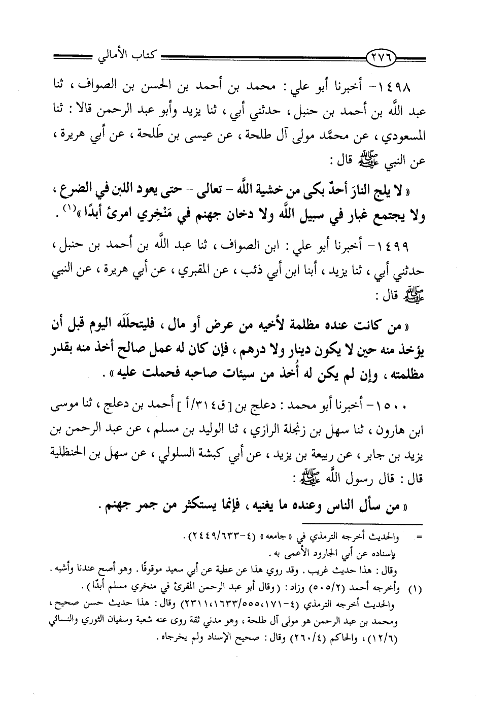 1498 - أَخْبَرَنَا أَبُو عَلِيٍّ مُحَمَّدُ بْنُ أَحْمَدَ بْنِ الْحَسَنِ الصَّوَّافُ، ثنا عَبْدُ اللَّهِ بْنُ أَحْمَدَ بْنِ حَنْبَلٍ، حَدَّثَنِي أَبِي، ثنا يَزِيدُ، وَأَبُو عَبْدِ الرَّحْمَنِ، قَالا: ثنا الْمَسْعُودِيُّ، عَنْ مُحَمَّدٍ , مَوْلَى آلِ طَلْحَةَ، عَنْ عِيسَى بْنِ طَلْحَةَ، عَنْ أَبِي هُرَيْرَةَ، عَنِ النَّبِيِّ صَلَّى اللَّهُ عَلَيْهِ وَسَلَّمَ , قَالَ: «لا يَلِجُ النَّارَ أَحَدٌ بَكَى مِنْ خَشْيَةِ اللَّهِ تَعَالَى حَتَّى يَعُودَ اللَّبَنُ فِي الضَّرْعِ، وَلا يَجْتَمِعُ غُبَارٌ فِي سَبِيلِ اللَّهِ وَلا دُخَانُ جَهَنَّمَ فِي مِنْخَرَيِ امْرِئٍ أَبَدًا»
