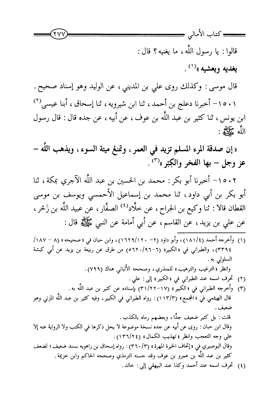 1502 - أَخْبَرَنَا أَبُو بَكْرٍ مُحَمَّدُ بْنُ الْحُسَيْنِ بْنِ عَبْدِ اللَّهِ الآجُرِيُّ، بِمَكَّةَ، ثنا أَبُو بَكْرِ بْنُ أَبِي دَاوُدَ، ثنا مُحَمَّدُ بْنُ إِسْمَاعِيلَ الأَحْمَسِيُّ، وَيُوسُفُ بْنُ مُوسَى الْقَطَّانُ، قَالا: ثنا وَكِيعُ بْنُ الْجَرَّاحِ، عَنْ خَلادٍ الصَّفَّارِ، عَنْ عُبَيْدِ اللَّهِ بْنِ زَحْرٍ، عَنْ عَلِيِّ بْنِ يَزِيدَ، عَنِ الْقَاسِمِ، عَنْ أَبِي أُمَامَةَ، عَنِ النَّبِيِّ صَلَّى اللَّهُ عَلَيْهِ وَسَلَّمَ، قَالَ: