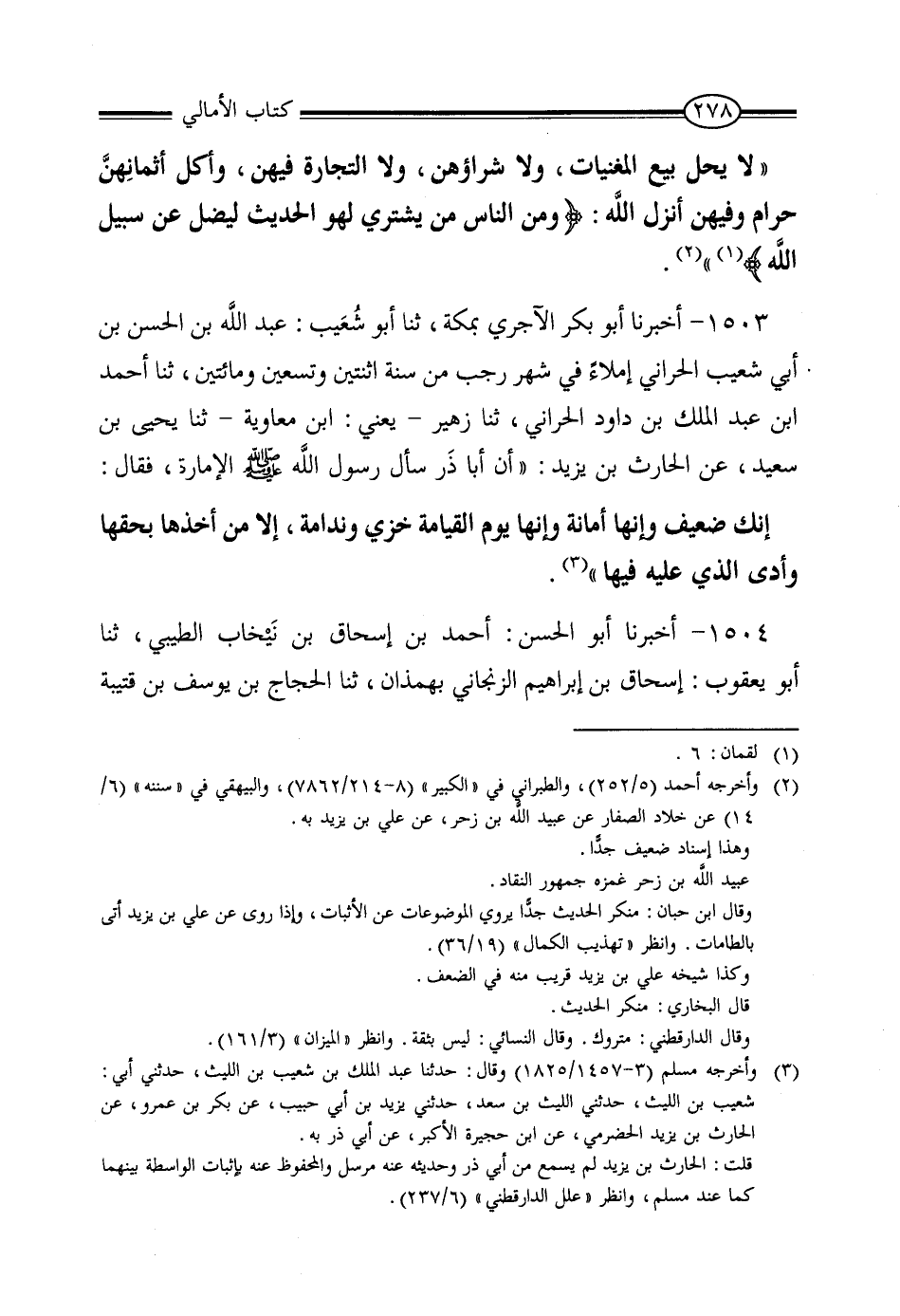 1503 - أَخْبَرَنَا أَبُو بَكْرٍ الآجُرِيُّ، بِمَكَّةَ، ثنا أَبُو شُعَيْبٍ عَبْدُ اللَّهِ بْنُ الْحَسَنِ بْنِ أَبِي شُعَيْبٍ الْحَرَّانِيُّ، إِمْلاءً فِي شَهْرِ رَجَبٍ مِنْ سَنَةِ اثْنَتَيْنِ وَتِسْعِينَ وَمِائَتَيْنِ، ثنا أَحْمَدُ بْنُ عَبْدِ الْمَلِكِ بْنِ وَاقِدٍ الْحَرَّانِيُّ، ثنا زُهَيْرٌ يَعْنِي ابْنَ مُعَاوِيَةَ، ثنا يَحْيَى بْنُ سَعِيدٍ، عَنِ الْحَارِثِ بْنِ يَزِيدَ، أَنَّ أَبَا ذَرٍّ، سَأَلَ رَسُولَ اللَّهِ صَلَّى اللَّهُ عَلَيْهِ وَسَلَّمَ الإِمَارَةَ، فَقَالَ: «إِنَّكَ ضَعِيفٌ، وَإِنَّهَا أَمَانَةٌ، وَإِنَّهَا يَوْمَ الْقِيَامَةِ خِزْيٌ وَنَدَامَةٌ، إِلا مَنْ أَخَذَهَا بِحَقِّهَا وَأَدَّى الَّذِي عَلَيْهِ فِيهَا»