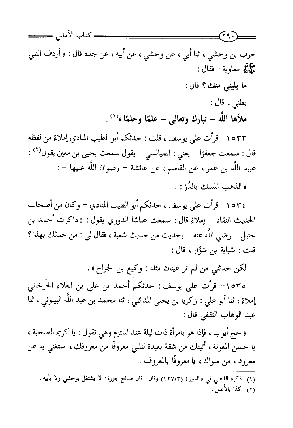 1533 - قَرَأْتُ عَلَى يُوسُفَ، قُلْتُ: حَدَّثَكُمْ أَبُو الطَّيِّبِ ابْنُ الْمُنَادِي، إِمْلاءً مِنْ لَفْظِهِ، قَالَ: سَمِعْتُ جَعْفَرًا يَعْنِي الطَّيَالِسِيَّ، يَقُولُ: سَمِعْتُ يَحْيَى بْنَ مَعِينٍ، يَقُولُ: عُبَيْدُ اللَّهِ بْنُ عُمَرَ عَنِ الْقَاسِمِ عَنْ عَائِشَةَ رِضْوَانُ اللَّهِ عَلَيْهَا، «الذَّهَبُ الْمُشَبَّكُ بِالدُّرِّ»