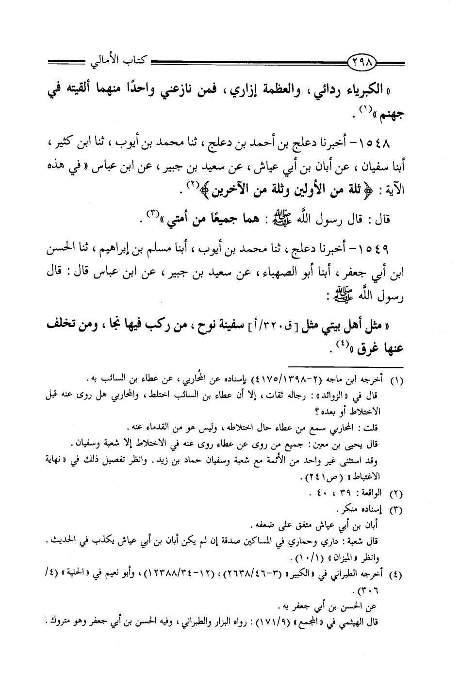 1549 - أَخْبَرَنَا دَعْلَجٌ، ثنا مُحَمَّدُ بْنُ أَيُّوبَ، أنبا مُسْلِمُ بْنُ إِبْرَاهِيمَ، ثنا الْحَسَنُ بْنُ أَبِي جَعْفَرٍ، أنبا أَبُو الصَّهْبَاءِ، عَنْ سَعِيدِ بْنِ جُبَيْرٍ، عَنِ ابْنِ عَبَّاسٍ، قَالَ: قَالَ رَسُولُ اللَّهِ صَلَّى اللَّهُ عَلَيْهِ وَسَلَّمَ: «مَثَلُ أَهْلِ بَيْتِي مَثَلُ سَفِينَةِ نُوحٍ، مَنْ رَكِبَ فِيهَا نَجَا، وَمَنْ تَخَلَّفَ عَنْهَا غَرِقَ»