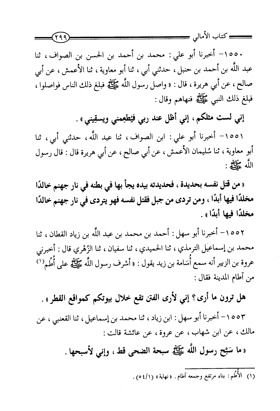 1550 - أَخْبَرَنَا أَبُو عَلِيٍّ مُحَمَّدُ بْنُ أَحْمَدَ بْنِ الْحَسَنِ بْنِ الصَّوَّافِ، ثنا عَبْدُ اللَّهِ بْنُ أَحْمَدَ بْنِ حَنْبَلٍ، حَدَّثَنِي أَبِي، ثنا أَبُو مُعَاوِيَةَ، ثنا الأَعْمَشُ، عَنْ أَبِي صَالِحٍ، عَنْ أَبِي هُرَيْرَةَ، قَالَ: وَاصَلَ رَسُولُ اللَّهِ صَلَّى اللَّهُ عَلَيْهِ وَسَلَّمَ، فَبَلَغَ ذَلِكَ النَّاسَ فَوَاصَلُوا، فَبَلَغَ ذَلِكَ النَّبِيَّ صَلَّى اللَّهُ عَلَيْهِ وَسَلَّمَ فَنَهَاهُمْ، وَقَالَ: «إِنِّي لَسْتُ مِثْلَكُمْ، إِنِّي أَظَلُّ عِنْدَ رَبِّي فَيُطْعِمُنِي وَيَسْقِينِي»