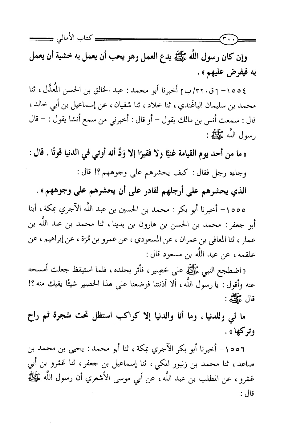 1555 - أَخْبَرَنَا أَبُو بَكْرٍ مُحَمَّدُ بْنُ الْحَسَنِ بْنِ عَبْدِ اللَّهِ الآجُرِّيُّ، بِمَكَّةَ , أنبا أَبُو جَعْفَرٍ مُحَمَّدُ بْنُ الْحَسَنِ بْنِ هَارُونَ بْنِ بَدِيْنَا، أنبا مُحَمَّدُ بْنُ عَبْدِ اللَّهِ بْنِ عَمَّارٍ، ثنا الْمُعَافَى بْنُ عِمْرَانَ، عَنِ الْمَسْعُودِيِّ، عَنْ عَمْرِو بْنِ مُرَّةَ، عَنْ إِبْرَاهِيمَ، عَنْ عَلْقَمَةَ، عَنْ عَبْدِ اللَّهِ بْنِ مَسْعُودٍ، قَالَ: اضْطَجَعَ النَّبِيُّ صَلَّى اللَّهُ عَلَيْهِ وَسَلَّمَ عَلَى حَصِيرٍ فَأَثَّرَ بِجِلْدِهِ، فَلَمَّا اسْتَيْقَظَ جَعَلْتُ أَمْسَحُهُ عَنْهُ، وَأَقُولُ: يَا رَسُولَ اللَّهِ، أَلا آذَنْتَنَا فَوَضَعْنَا عَلَى هَذَا الْحَصِيرِ شَيْئًا يَقِيكَ مِنْهُ، فَقَالَ صَلَّى اللَّهُ عَلَيْهِ وَسَلَّمَ: «مَا لِي وَلِلدُّنْيَا، وَمَا أَنَا وَالدُّنْيَا إِلا كَرَاكِبٍ اسْتَظَلَّ تَحْتَ شَجَرَةٍ ثُمَّ رَاحَ وَتَرَكَهَا»