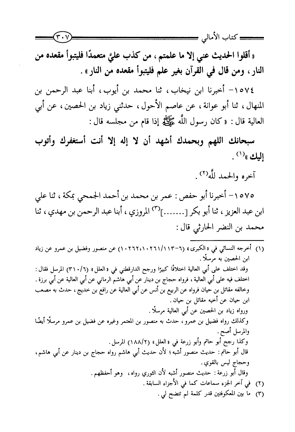 1574 - أَخْبَرَنَا ابْنُ بِنْجَابٍ، ثنا مُحَمَّدُ بْنُ أَيُّوبَ، أنبا عَبْدُ الرَّحْمَنِ بْنُ الْمُبَارَكِ، ثنا أَبُو عَوَانَةَ، عَنْ عَاصِمٍ الأَحْوَلِ، حَدَّثَنِي زِيَادُ بْنُ الْحُصَيْنِ، عَنْ أَبِي الْعَالِيَةِ، قَالَ: كَانَ رَسُولُ اللَّهِ صَلَّى اللَّهُ عَلَيْهِ وَسَلَّمَ إِذَا قَامَ مِنْ مَجْلِسِهِ، قَالَ: «سُبْحَانَكَ اللَّهُمَّ وَبِحَمْدِكَ لا إِلَهَ إِلا أَنْتَ أَسْتَغْفِرُكَ وَأَتُوبُ إِلَيْكَ»