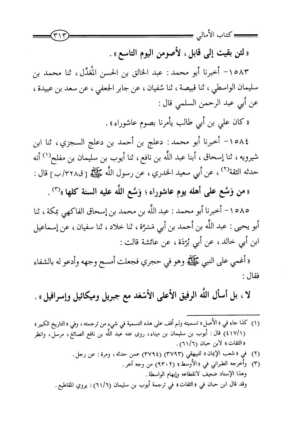 1584 - أَخْبَرَنَا أَبُو مُحَمَّدٍ: دَعْلَجُ بْنُ أَحْمَدَ بْنِ دَعْلَجٍ السِّجْزِيُّ، ثنا ابْنُ شِيرَوَيْهِ، ثنا إِسْحَاقُ، أبنا عَبْدُ اللَّهِ بْنُ نَافِعٍ، ثنا أَيُّوبُ بْنُ سُلَيْمَانَ بْنِ مُفْلِحٍ، أَنَّهُ حَدَّثَهُ الثِّقَةُ، عَنْ أَبِي سَعِيدٍ الْخُدْرِيِّ، عَنْ رَسُولِ اللَّهِ , صَلَّى اللَّهُ عَلَيْهِ وَسَلَّمَ , قَالَ: مَنْ وَسَّعَ عَلَى أَهْلِهِ يَوْمَ عَاشُورَاءَ؛ وَسَّعَ اللَّهُ عَلَيْهِ السَّنَةَ كُلَّهَا