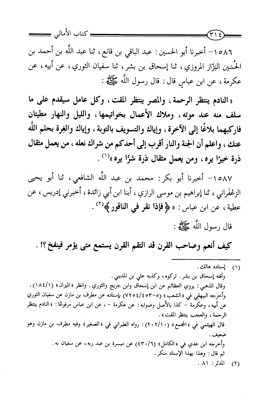 1587 - أَخْبَرَنَا أَبُو بَكْرٍ: مُحَمَّدُ بْنُ عَبْدِ اللَّهِ الشَّافِعِيُّ، ثنا أَبُو يَحْيَى الزَّعْفَرَانِيُّ، ثنا إِبْرَاهِيمُ بْنُ مُوسَى الرَّازِيُّ، أبنا ابْنُ أَبِي زَائِدَةَ، أَخْبَرَنِي إِدْرِيسُ، عَنْ عَطِيَّةَ، عَنِ ابْنِ عَبَّاسٍ: {فَإِذَا نُقِرَ فِي النَّاقُورِ} [المدثر: 8] قَالَ رَسُولُ اللَّهِ , صَلَّى اللَّهُ عَلَيْهِ وَسَلَّمَ: كَيْفَ أَنْعَمُ وَصَاحِبُ الْقَرْنِ قَدِ الْتَقَمَ الْقَرْنَ يَسْتَمِعُ مَتَى يُؤْمَرُ فَيَنْفُخُ؟ !