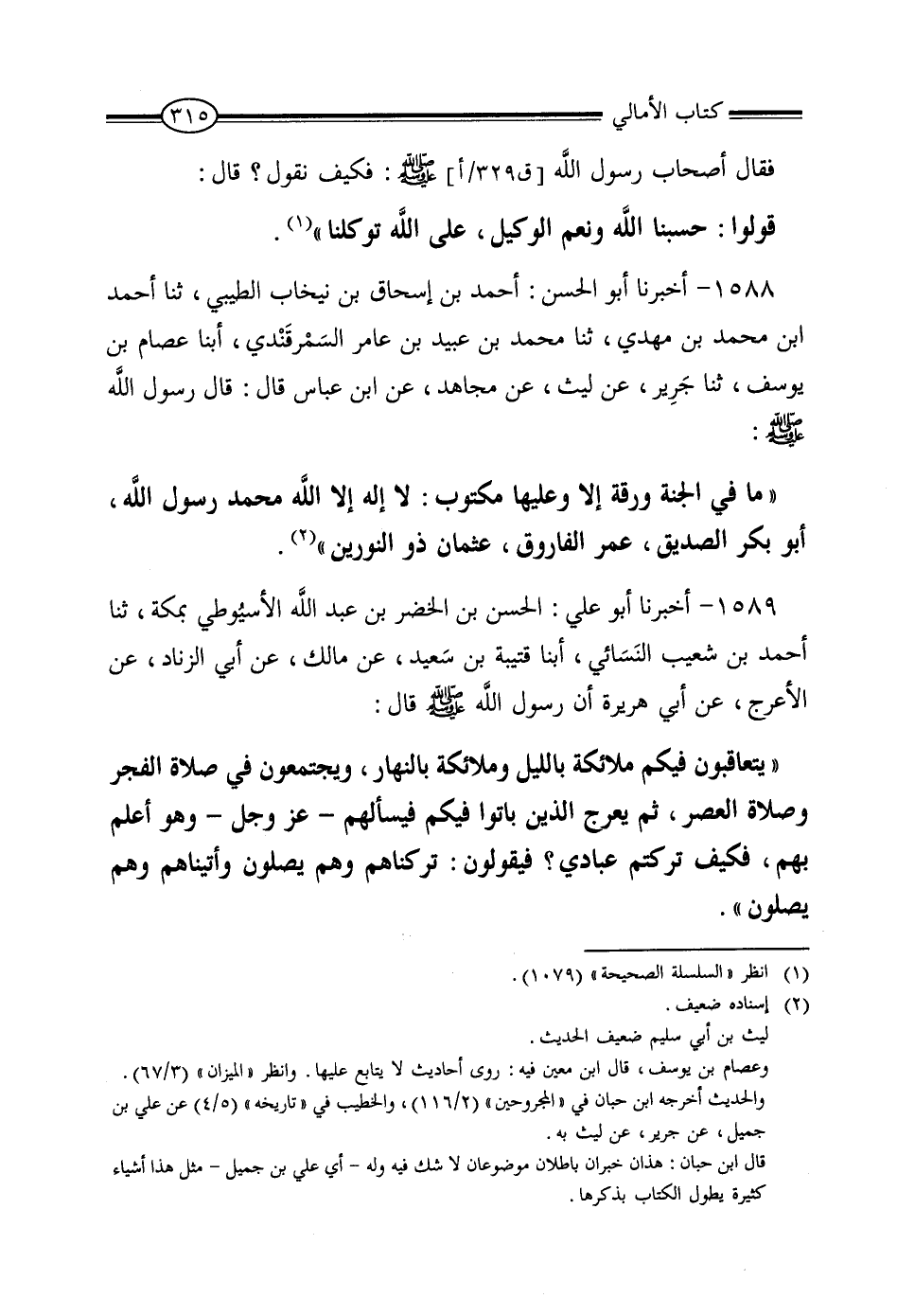1588 - أَخْبَرَنَا أَبُو الْحَسَنِ: أَحْمَدُ بْنُ إِسْحَاقَ بْنِ نِيخَابَ الطِّيبِيُّ، ثنا أَحْمَدُ بْنُ مُحَمَّدِ بْنِ مَهْدِيٍّ، ثنا مُحَمَّدُ بْنُ عُبَيْدِ بْنِ عَامِرٍ السَّمَرْقَنِدُّي، أبنا عِصَامُ بْنُ يُوسُفَ، ثنا جَرِيرٌ، عَنْ لَيْثٍ، عَنْ مُجَاهِدٍ، عَنِ ابْنِ عَبَّاسٍ، قَالَ: قَالَ رَسُولُ اللَّهِ , صَلَّى اللَّهُ عَلَيْهِ وَسَلَّمَ: مَا فِي الْجَنَّةِ وَرَقَةٌ إِلا وَعَلَيْهَا مَكْتُوبٌ: لا إِلَهَ إِلا اللَّهُ مُحَمَّدٌ رَسُولُ اللَّهِ، أَبُو بَكْرٍ الصِّدِّيقُ، عُمَرُ الْفَارُوقُ، عُثْمَانُ ذُو النُّورَيْنِ.