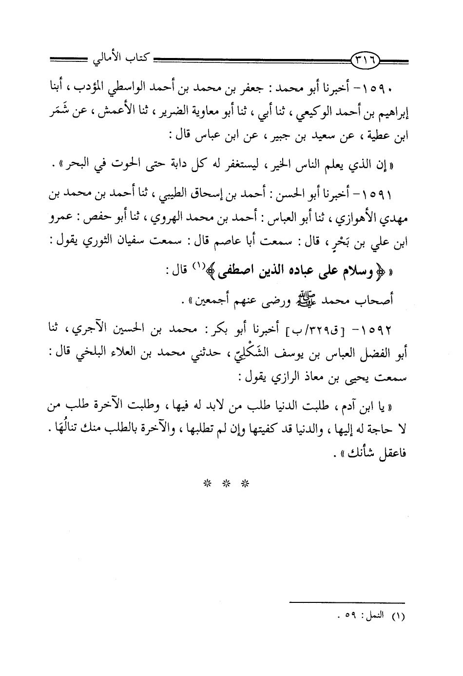 1591 - أَخْبَرَنَا أَبُو الْحَسَنِ: أَحْمَدُ بْنُ إِسْحَاقَ الطِّيبِيُّ، ثنا أَحْمَدُ بْنُ مُحَمَّدِ بْنِ مَهْدِيٍّ الأَهْوَازِيُّ، ثنا أَبُو الْعَبَّاسِ: أَحْمَدُ بْنُ مُحَمَّدٍ الْهَرَوِيُّ، ثنا أَبُو حَفْصٍ: عَمْرُو بْنُ عَلِيِّ بْنِ بَحْرٍ، قَالَ: سَمِعْتُ أَبَا عَاصِمٍ، قَالَ: سَمِعْتُ سُفْيَانَ الثَّوْرِيَّ يَقُولُ: {وَسَلامٌ عَلَى عِبَادِهِ الَّذِينَ اصْطَفَى} [النمل: 59] قَالَ: أَصْحَابِ رَسُولِ اللَّهِ , صَلَّى اللَّهُ عَلَيْهِ وَسَلَّمَ , وَرَضِيَ عَنْهُمْ أَجْمَعِينَ.