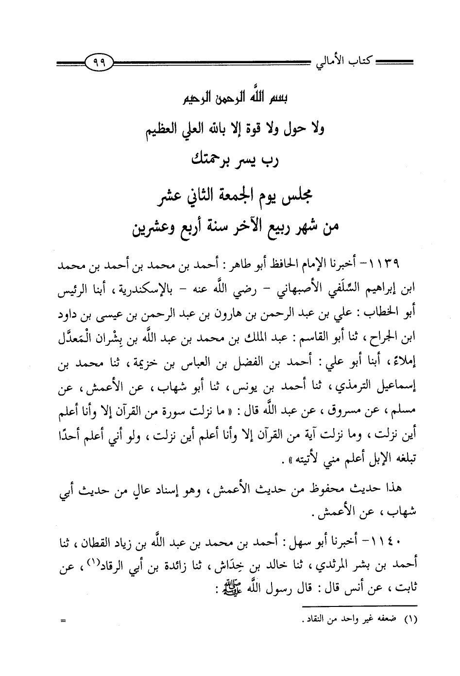 1139 - أَخْبَرَنَا الْإِمَامُ الْحَافِظُ أَبُو طَاهِرٍ أَحْمَدُ بْنُ مُحَمَّدِ بْنِ أَحْمَدَ بْنِ مُحَمَّدِ بْنِ إِبْرَاهِيمَ السِّلَفِيُّ الأَصْبَهَانِيُّ , رَضِيَ اللَّهُ عَنْهُ، بِالإِسْكَنْدَرِيَّةِ , أنا الرَّئِيسُ أَبُو الْخَطَّابِ عَلِيُّ بْنُ عَبْدِ الرَّحْمَنِ بْنِ هَارُونَ بْنِ عَبْدِ الرَّحْمَنِ بْنِ عِيسَى بْنِ دَاوُدَ بْنِ الْجَرَّاحِ، ثنا أَبُو الْقَاسِمِ عَبْدُ الْمَلِكِ بْنُ مُحَمَّدِ بْنِ عَبْدِ اللَّهِ بْنِ بِشْرَانَ الْمُعَدَّلُ، إِمْلاءً , أنبا أَبُو عَلِيٍّ أَحْمَدُ بْنُ الْفَضْلِ بْنِ الْعَبَّاسِ بْنِ خُزَيْمَةَ , ثنا مُحَمَّدُ بْنُ إِسْمَاعِيلَ التِّرْمِذِيُّ , ثنا أَحْمَدُ بْنُ يُونُسَ , ثنا أَبُو شِهَابٍ , عَنِ الْأَعْمَشِ , عَنْ مُسْلِمٍ , عَنْ مَسْرُوقٍ , عَنْ عَبْدِ اللَّهِ , قَال: «مَا نَزَلَتْ سُورَةٌ مِنَ الْقُرْآنِ إِلا وَأَنَا أَعْلَمُ أَيْنَ نَزَلَتْ؟ وَمَا نَزَلَتْ آيَةٌ مِنَ الْقُرْآنِ إِلا وَأَنَا أَعْلَمُ أَيْنَ نَزَلَتْ؟ وَلَوْ أَنِّي أَعْلَمُ أَحَدًا تَبْلُغُهُ الإِبِلُ أَعْلَمُ مِنِّي لأَتَيْتُهُ» .