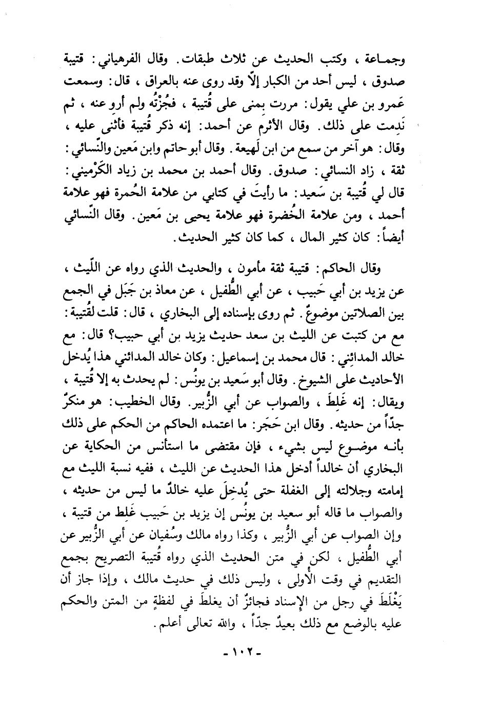 وقال الحاكم: قتيبة ثقة مأمون، والحديث الذي رواه عن اللّيث، عن يزيد بن أبي حَبيب، عن أبي الطُّفيل، عن معاذ بن جَبَل في الجمع بين الصلاتين موضوعٌ. ثم روى بإسناده إلى البخاري، قال: قلت لقُتيبة: مع من كتبت عن الليث بن سعد حديث يزيد بن أبي حبيب؟ قال: مع خالد المدائِني: قال محمَّد بن إسماعيل: وكان خالد المدائني هذا يُدخل الأحاديث على الشيوخ. وقال أبو سَعيد بن يونُس: لم يحدث به إلا قُتيبة، ويقال: إنه غَلِطَ، والصواب عن أبي الزُّبير. وقال الخطيب: هو منكرٌ جدًّا من حديثه. وقال ابن حَجَر: ما اعتمده الحاكم من الحكم على ذلك بأنه موضوع ليس بشيء، فإن مقتضى ما استأنس من الحكاية عن البخاري أن خالدًا أدخل هذا الحديث عن الليث، ففيه نسبة الليث مع إمامته وجلالته إلى الغفلة حتى يُدخِلَ عليه خالدٌ ما ليس من حديثه، والصواب ما قاله أبو سعيد بن يونُس إن يزيد بن حَبيب غَلِط من قتيبة، وإن الصواب عن أبي الزُّبير، وكذا رواه مالك وسُفيان عن أبي الزُّبير عن أبي الطفيل، لكن في متن الحديث الذي رواه قُتيبة التصريح بجمع التقديم في وقت الأُولى، وليس ذلك في حديث مالك، وإذا جاز أن يَغْلَطَ في رجل من الإِسناد فجائزٌ أن يغلطَ في لفظةٍ من المتن والحكم عليه بالوضع مع ذلك بعيدٌ جدًّا، والله تعالى أعلم.