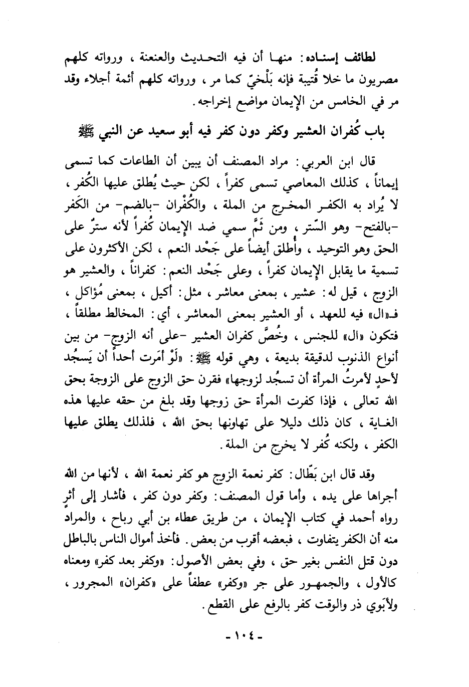 قال ابن العربي: مراد المصنف أن يبين أن الطاعات كما تسمى إيمانًا، كذلك المعاصي تسمى كفرًا، لكن حيث يُطلق عليها الكُفر، لا يُراد به الكفر المخرج منِ الملة، والكُفْران -بالضم- من الكَفر -بالفتح- وهو السّتر، ومن ثَمَّ سمي ضد الإِيمان كُفرًا لأنه سترٌ على الحق وهو التوحيد، وأُطلق أيضًا على جَحْد النعم، لكن الأكثرون على تسمية ما يقابل الإِيمان كفرًا، وعلى جَحْد النعم: كفرانًا، والعشير هو الزوج، قيل له: عشير، بمعنى معاشر، مثل: أكيل، بمعنى مُؤاكل، فـ "ال" فيه للعهد، أو العشير بمعنى المعاشر، أي: المخالط مطلقًا، فتكون "ال" للجنس، وخُصَّ كفران العشير -على أنه الزوج- من بين أنواع الذنوب لدقيقة بديعة، وهي قوله - صلى الله عليه وسلم -: "لَوْ أمَرت أحدًا أن يَسجُد لأحدٍ لأمرتُ المرأة أن تسجُد لزوجها" فقرن حق الزوج على الزوجة بحق الله تعالى، فإذا كفرت المرأة حق زوجها وقد بلغ من حقه عليها هذه الغاية، كان ذلك دليلًا على تهاونها بحق الله، فلذلك يطلق عليها الكفر، ولكنه كُفر لا يخرج من الملة.