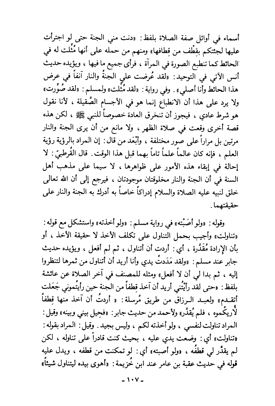 أسماء في أوائل صفة الصلاة بلفظ: "دنت مني الجنة حتى لو اجترأت عليها لجئتكم بقِطْف من قِطافها" ومنهم من حمله على أنها مُثِّلت له في الحائط كما تنطبع الصورة في المرآة، فرأى جميع ما فيها، ويؤيده حديث أنس الآتي في التوحيد: "لقد عُرضت علي الجنةُ والنار آنفًا في عرض هذا الحائط وأنا أصلي". وفي رواية: "لقد مُثِّلت" ولمسلم: "لقد صُوِّرت" ولا يرد على هذا أن الانطباع إنما هو في الأجسام الصَّقيلة، لأنا نقول هو شرط عادي، فيجوز أن تنخرق العادة خصوصًا للنبي - صلى الله عليه وسلم -، لكن هذه قصة أخرى وقعت في صلاة الظهر، ولا مانع من أن يرى الجنة والنار مرتين بل مرارًا على صور مختلفة، وأبْعَد من قال: إن المراد بالرؤية رؤية العلم، فإنه كان عالمًا علمًا تامًا بهما قبل هذا الوقت. قال القُرطبيّ: لا إِحالة في إبقاء هذه الأمور على ظواهرها، سيما على مذهب أهل السنة في أن الجنة والنار مخلوقتان موجودتان، فيرجع إلى أن الله تعالى خلق لنبيه عليه الصلاة والسلام إدراكًا خاصًا به أدرك به الجنة والنار على حقيقتهما.