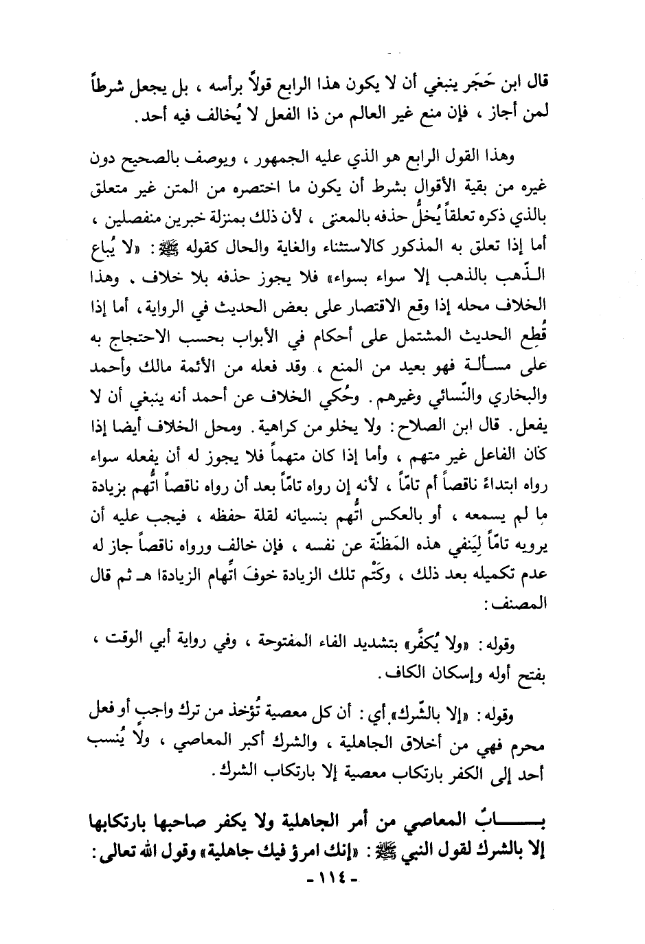 وهذا القول الرابع هو الذي عليه الجمهور، ويوصف بالصحيح دون غيره من بقية الأقوال بشرط أن يكون ما اختصره من المتن غير متعلق بالذي ذكره تعلقًا يُخلُّ حذفه بالمعنى، لأن ذلك بمنزلة خبرين منفصلين، أما إذا تعلق به المذكور كالاستثناء والغاية والحال كقوله - صلى الله عليه وسلم -: "لا يُباع الذّهب بالذهب إلا سواء بسواء" فلا يجوز حذفه بلا خلاف، وهذا الخلاف محله إذا وقع الاقتصار على بعض الحديث في الرواية، أما إذا قُطِع الحديث المشتمل على أحكام في الأبواب بحسب الاحتجاج به على مسألة فهو بعيد من المنع، وقد فعله من الأئمة مالك وأحمد والبخاري والنّسائي وغيرهم. وحُكي الخلاف عن أحمد أنه ينبغي أن لا يفعل. قال ابن الصلاح: ولا يخلو من كراهية. ومحل الخلاف أيضًا إذا كان الفاعل غير متهم، وأما إذا كان متهمًا فلا يجوز له أن يفعله سواء رواه ابتداءً ناقصًا أم تامًّا، لأنه إن رواه تامًّا بعد أن رواه ناقصًا اتُّهم بزيادة ما لم يسمعه، أو بالعكس اتُّهم بنسيانه لقلة حفظه، فيجب عليه أن يرويه تامًّا لِيَنفي هذه المَظنّة عن نفسه، فإن خالف ورواه ناقصًا جاز له عدم تكميله بعد ذلك، وكَتْم تلك الزيادة خوفَ اتِّهام الزيادة اهـ ثم قال المصنف: