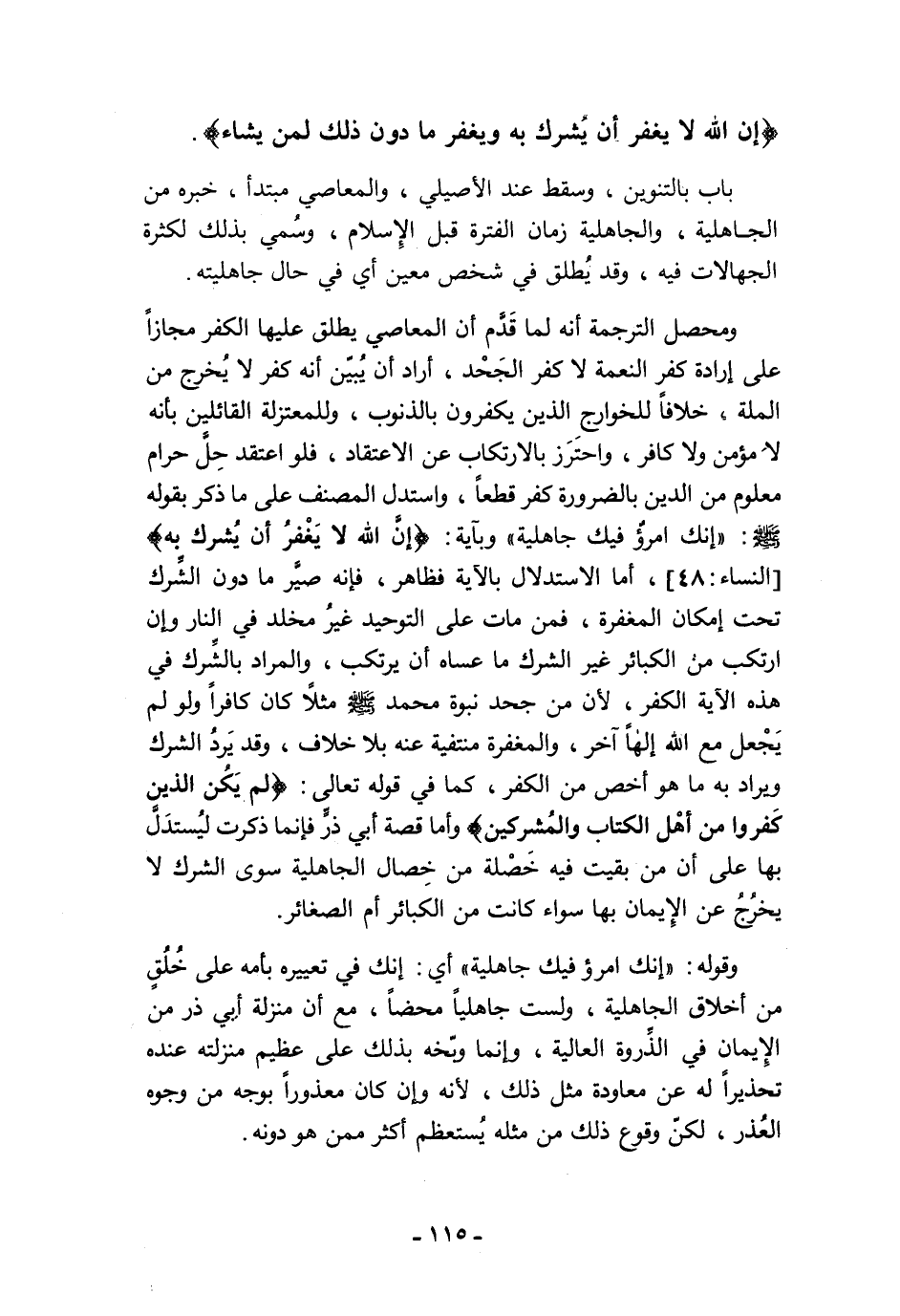 ومحصل الترجمة أنه لما قَدَّم أن المعاصي يطلق عليها الكفر مجازًا على إرادة كفر النعمة لا كفر الجَحْد، أراد أن يُبّين أنه كفر لا يُخرج من الملة، خلافًا للخوارج الذين يكفرون بالذنوب، وللمعتزلة القائلين بأنه لا مؤمن ولا كافر، واحتَرَز بالارتكاب عن الاعتقاد، فلو اعتقد حِلَّ حرام معلوم من الدين بالضرورة كفر قطعًا، واستدل المصنف على ما ذكر بقوله - صلى الله عليه وسلم -: "إنك امرؤٌ فيك جاهلية" وبآية: {إِنَّ اللَّهَ لَا يَغْفِرُ أَنْ يُشْرَكَ بِهِ} [النساء: 48]، أما الاستدلال بالآية فظاهر، فإنه صيَّر ما دون الشِّرك تحت إمكان المغفرة، فمن مات على التوحيد غيرُ مخلد في النار وإن ارتكب من الكبائر غير الشرك ما عساه أن يرتكب، والمراد بالشِّرك في هذه الآية الكفر، لأن من جحد نبوة محمَّد - صلى الله عليه وسلم - مثلًا كان كافرًا ولو لم يَجْعل مع الله إلهًا آخر، والمغفرة منتفية عنه بلا خلاف، وقد يَردُ الشرك ويراد به ما هو أخص من الكفر، كما في قوله تعالى: {لَمْ يَكُنِ الَّذِينَ كَفَرُوا مِنْ أَهْلِ الْكِتَابِ وَالْمُشْرِكِينَ} وأما قصة أبي ذرٍّ فإنما ذكرت ليُستدَلَّ بها على أن من بقيت فيه خَصْلة من خِصال الجاهلية سوى الشرك لا يخرُجُ عن الإِيمان بها سواء كانت من الكبائر أم الصغائر.