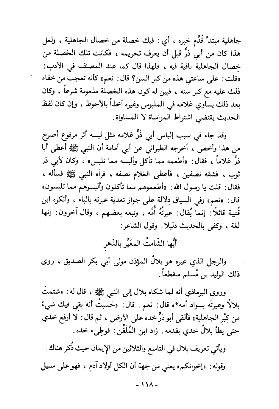 وقد جاء في سبب إلباس أبي ذَرٍّ غلامه مثل لبسه أثر مرفوع أصرح من هذا وأخص، أخرجه الطبراني عن أبي أمامة أن النبي - صلى الله عليه وسلم - أعطى أبا ذرٍّ غلامًا، فقال: "أطعمه مما تأكل وألبسه مما تلبس"، وكان لأبي ذر ثوب، فشقه نصفين، فأعطى الغلام نصفه، فرآه النبي- صلى الله عليه وسلم - فسأله، فقال: قلت يا رسول الله: "أطعموهم مما تأكلون وألبسوهم مما تلبسون" قال: "نعم" وفي السياق دِلالة على جواز تعدية عيرته بالباء، وأنكره ابن قُتيبة قائلًا: إنما يُقال: عيرتُهُ أُمَّه، وتبعه بعضهم، وقال آخرون: إنها لغة، وكفى بالحديث دليلًا. وقول الشاعر: