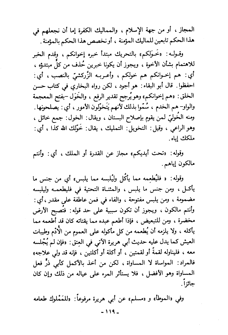 وقوله: "فليُطعِمه مما يأكُل وليُلبسه مما يلبس" أي من جنس ما يأكل، ومن جنس ما يلبس، والمثناة التحتية في فليطعمه وليلبسه مضمومة، ومن يلبس مفتوحة، والفاء في فمن عاطفة على مقدر، أي: وأنتم مالكون، ويجوز أن تكون سببية على حد قوله: فتُصبح الأرض مخضرة، ومن للتبعيض، فإذا أطعم عبده مما يقتاته كان قد أطعمه مما يأكله، ولا يلزمه أن يُطعمه من كل مأكوله على العموم من الأُدْم وطيبات العيش كما يدل عليه حديث أبي هريرة الآتي في العِتق: "فإن لم يُجْلسه معه، فليناوله لقمةً أو لقمتين، أو أكلة أو أكلتين، فإنه قد ولي علاجه" فالمراد: المواساة لا المساواة، لكن من أخذ بالأكمل كأبي ذرٍّ فعل المساواة وهو الأفضل، فلا يستأثر المرء على عياله من ذلك وإن كان جائزًا.