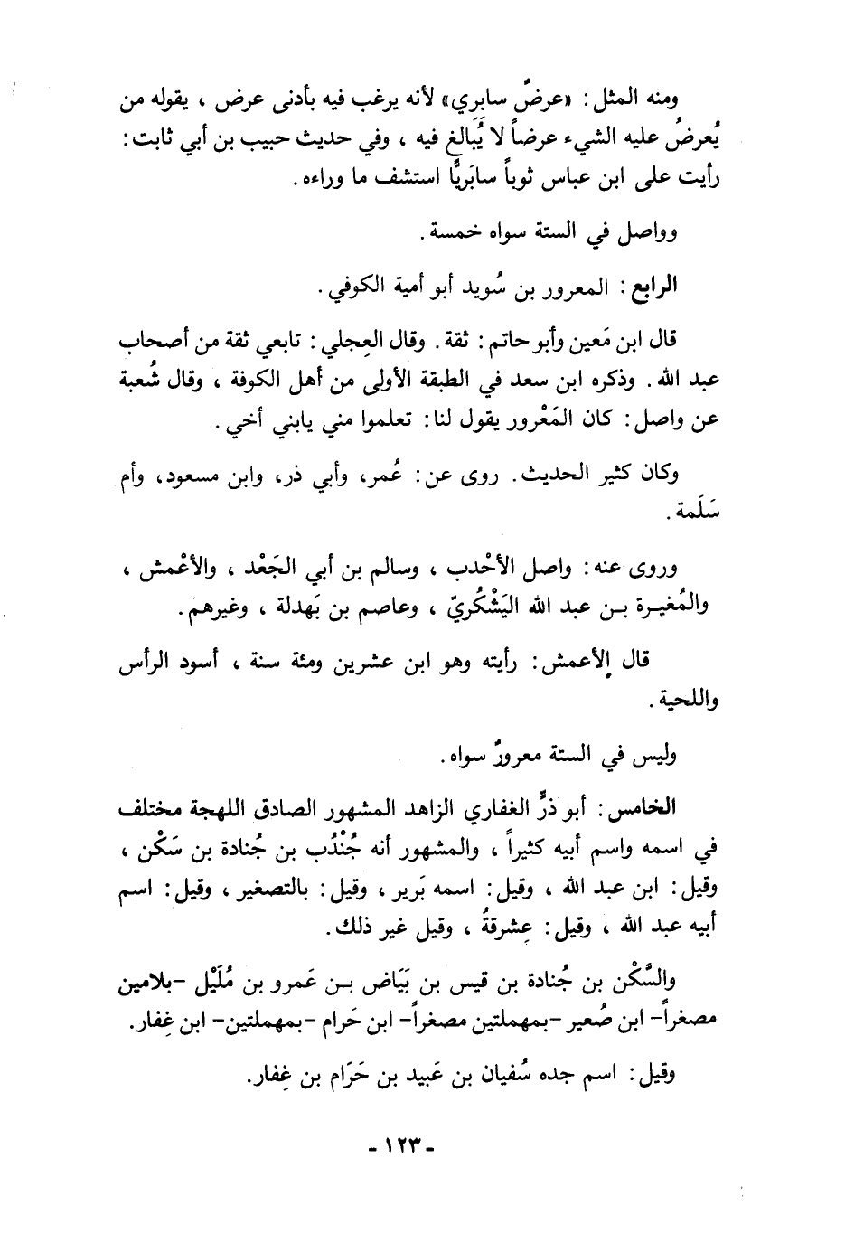 الخامس: أبو ذرٍّ الغفاري الزاهد المشهور الصادق اللهجة مختلف في اسمه واسم أبيه كثيرًا، والمشهور أنه جُنْدُب بن جُنادة بن سَكْن، وقيل: ابن عبد الله، وقيل: اسمه بَرير، وقيل: بالتصغير، وقيل: اسم أبيه عبد الله، وقيل: عِشرقةُ، وقيل غير ذلك.