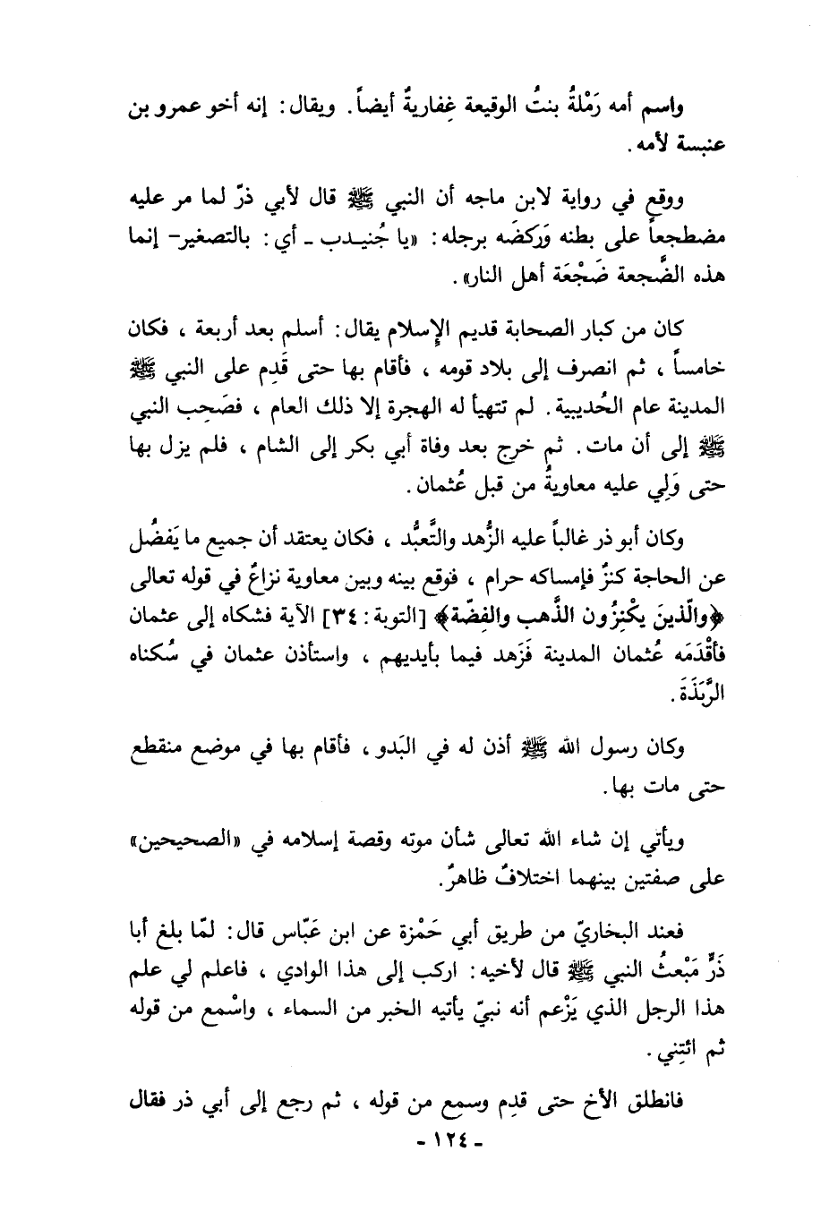 وكان أبو ذر غالبًا عليه الزُّهد والتَّعبُّد، فكان يعتقد أن جميع ما يَفضُل عن الحاجة كنزٌ فإمساكه حرام، فوقع بينه وبين معاوية نزاعٌ في قوله تعالى {وَالَّذِينَ يَكْنِزُونَ الذَّهَبَ وَالْفِضَّةَ} [التوبة: 34] الآية فشكاه إلى عثمان فأقْدَمَه عُثمان المدينة فَزَهد فيما بأيديهم، واستأذن عثمان في سُكناه الرَّبَذَةَ.