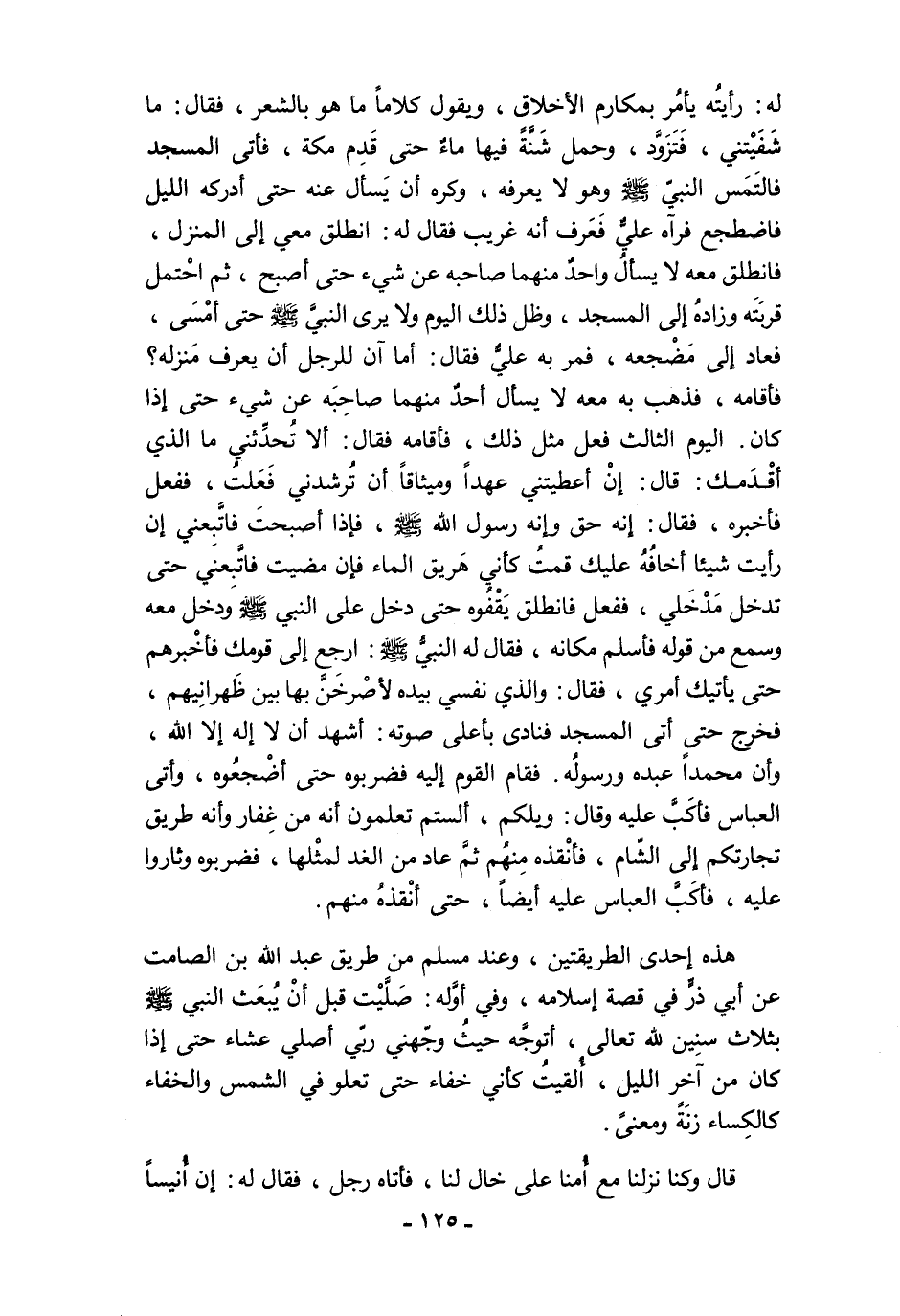 له: رأيتُه يأمُر بمكارم الأخلاق، ويقول كلامًا ما هو بالشعر، فقال: ما شَفَيْتني، فَتَزَوَّد، وحمل شَنَّةً فيها ماءٌ حتى قَدِم مكة، فأتى المسجد فالتَمَس النبيّ - صلى الله عليه وسلم - وهو لا يعرفه، وكره أن يَسأل عنه حتى أدركه الليل فاضطجع فرآه عليٌّ فَعَرف أنه غريب فقال له: انطلق معي إلى المنزل، فانطلق معه لا يسألُ واحدٌ منهما صاحبه عن شيء حتى أصبح، ثم احْتمل قربَتَه وزادهُ إلى المسجد، وظل ذلك اليوم ولا يرى النبيَّ - صلى الله عليه وسلم - حتى أمْسَى، فعاد إلى مَضْجعه، فمر به عليٌّ فقال: أما آن للرجل أن يعرف مَنزله؟ فأقامه، فذهب به معه لا يسأل أحدٌ منهما صاحِبَه عن شيء حتى إذا كان. اليوم الثالث فعل مثل ذلك، فأقامه فقال: ألا تُحدِّثني ما الذي أقْدَمك: قال: إنْ أعطيتني عهدًا وميثاقًا أن تُرشدني فَعَلتُ، ففعل فأخبره، فقال: إنه حق وإنه رسول الله - صلى الله عليه وسلم -، فإذا أصبحتَ فاتَّبِعني إن رأيت شيئًا أخافُهُ عليك قمتُ كأنى هَريق الماء فإن مضيت فاتَّبِعني حتى تدخل مَدْخَلي، ففعل فانطلق يَقْفُوه حتى دخل على النبي - صلى الله عليه وسلم - ودخل معه وسمع من قوله فأسلم مكانه، فقال له النبيُّ - صلى الله عليه وسلم -: ارجع إلى قومك فأخْبرهم حتى يأتيك أمري، فقال: والذي نفسي بيده لأصْرخَنَّ بها بين ظَهرانِيهم، فخرج حتى أتى المسجد فنادى بأعلى صوته: أشهد أن لا إله إلا الله، وأن محمدًا عبده ورسولُه. فقام القوم إليه فضربوه حتى أضْجعُوه، وأتى العباس فأكَبَّ عليه وقال: ويلكم، ألستم تعلمون أنه من غِفار وأنه طريق تجارتكم إلى الشّام، فأنْقذه مِنهُم ثمَّ عاد من الغد لمثْلها، فضربوه وثاروا عليه، فأكَبَّ العباس عليه أيضًا، حتى أنْقذهُ منهم.