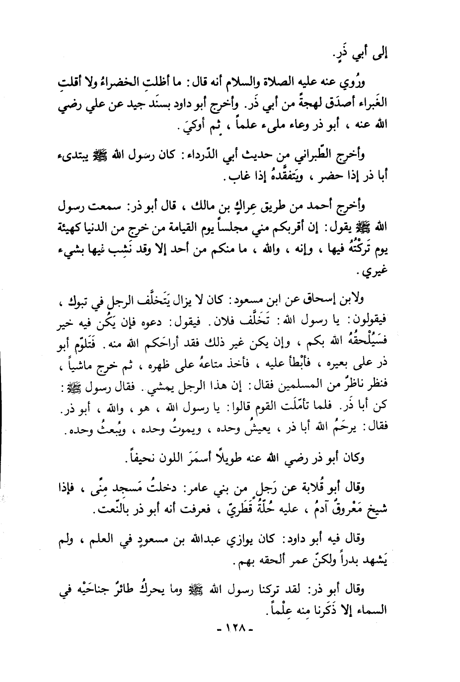 وأخرج الطّبراني من حديث أبي الدّرداء: كان رسول الله - صلى الله عليه وسلم - يبتدىء أبا ذر إذا حضر، ويَتفقَّدهُ إذا غاب.