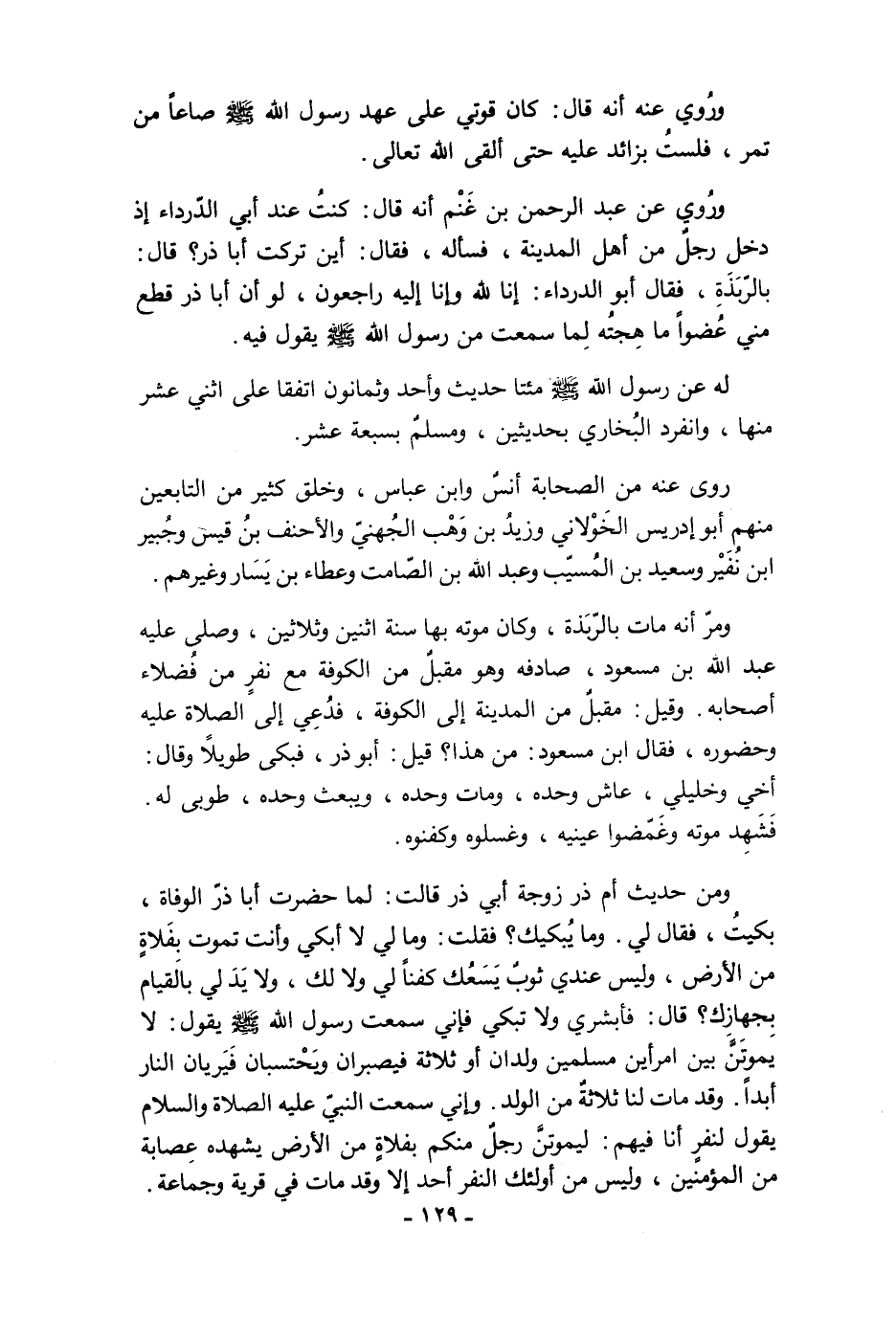 ومن حديث أم ذر زوجة أبي ذر قالت: لما حضرت أبا ذرّ الوفاة، بكيتُ، فقال لي. وما يُبكيك؟ فقلت: وما لي لا أبكي وأنت تموت بِفَلاةٍ من الأرض، وليس عندي ثوبٌ يَسَعُك كفنًا لي ولا لك، ولا يَدَ لي بالقيام بِجهازِك؟ قال: فأبشري ولا تبكي فإني سمعت رسول الله - صلى الله عليه وسلم - يقول: لا يموتَنَّ بين امرأين مسلمين ولدان أو ثلاثة فيصبران ويَحْتسبان فَيَريان النار أبدًا. وقد مات لنا ثلاثةٌ من الولد. وإني سمعت النبيّ عليه الصلاة والسلام يقول لنفرٍ أنا فيهم: ليموتن رجلٌ منكم بفلاةٍ من الأرض يشهده عِصابة من المؤمنين، وليس من أولئك النفر أحد إلا وقد مات في قرية وجماعة.
