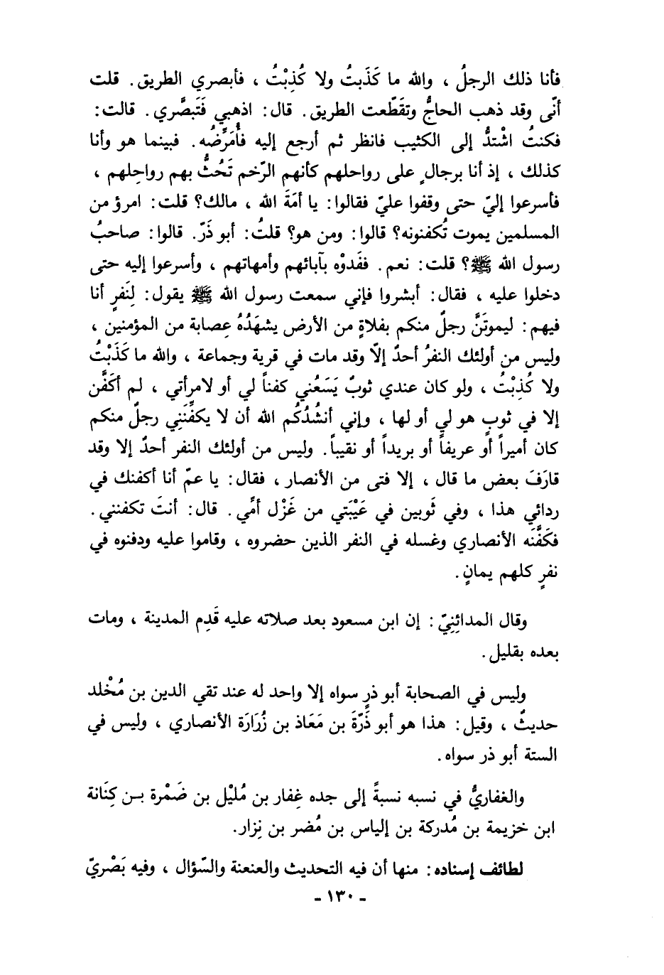 فأنا ذلك الرجلُ، والله ما كَذَبتُ ولا كُذِبْتُ، فأبصري الطريق. قلت أنّى وقد ذهب الحاجُّ وتقَطّعت الطريق. قال: اذهبي فَتَبصَّري. قالت: فكنتُ اشْتدُّ إلى الكثيب فانظر ثم أرجع إليه فأُمَرِّضُه. فبينما هو وأنا كذلك، إذ أنا برجالٍ على رواحلهم كأنهم الرّخم تَحُثُّ بهم رواحِلهم، فأسرعوا إليّ حتى وقفوا عليّ فقالوا: يا أمَةَ الله، مالك؟ قلت: امرؤ من المسلمين يموت تُكفنونه؟ قالوا: ومن هو؟ قلتُ: أبو ذَرّ. قالوا: صاحبُ رسول الله - صلى الله عليه وسلم -؟ قلت: نعم. ففَدوْه بآبائهم وأمهاتهم، وأسرعوا إليه حتى دخلوا عليه، فقال: أبشروا فإني سمعت رسول الله - صلى الله عليه وسلم - يقول: لِنَفرٍ أنا فيهم: ليموتَنَّ رجلٌ منكم بفلاةٍ من الأرض يشهَدُهُ عِصابة من المؤمنين، وليس من أولئك النفرُ أحدٌ إلَّا وقد مات في قرية وجماعة، والله ما كَذَبْتُ ولا كُذِبْتُ، ولو كان عندي ثوبٌ يَسَعُني كفنًا لي أو لامرأتي، لم أكَفِّن إلا في ثوبٍ هو لي أولها، وإني أنشُدُكُم الله أن لا يكفِّنَنِي رجلٌ منكم كان أميرًا أو عريفًا أو بريدًا أو نقيبًا. وليس من أولئك النفر أحدٌ إلا وقد قارَفَ بعض ما قال، إلا فتى من الأنصار، فقال: يا عمّ أنا أكفنك في ردائي هذا، وفي ثَوبين في عَيْبَتي من غَزْل أمِّي. قال: أنتَ تكفنني.