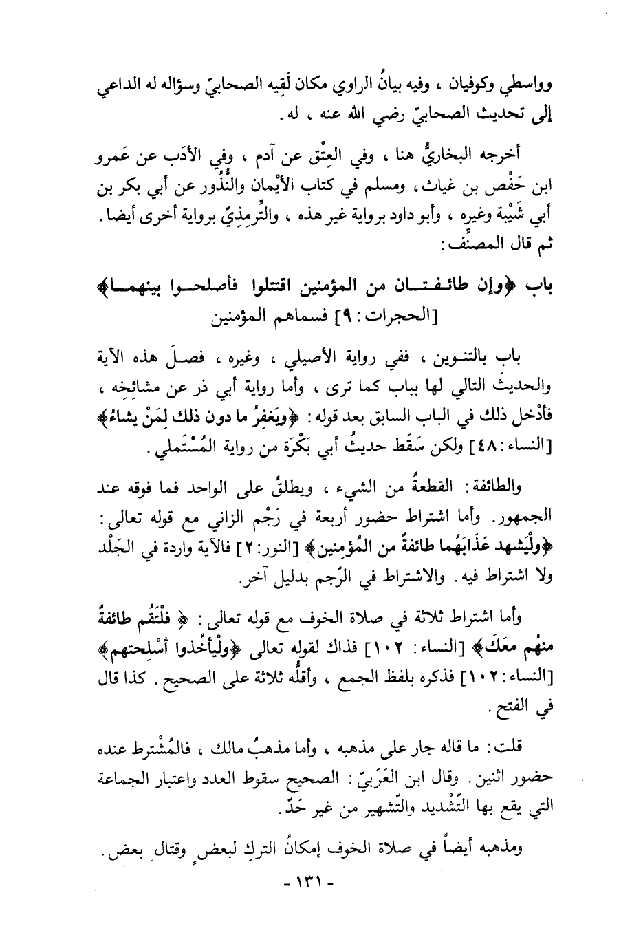 والطائفة: القطعةُ من الشيء، ويطلقُ على الواحد فما فوقه عند الجمهور. وأما اشتراط حضور أربعة في رَجْم الزاني مع قوله تعالى: {وَلْيَشْهَدْ عَذَابَهُمَا طَائِفَةٌ مِنَ الْمُؤْمِنِينَ} [النور: 2] فالآية واردة في الجَلْد ولا اشتراط فيه. والاشتراط في الرّجم بدليل آخر.