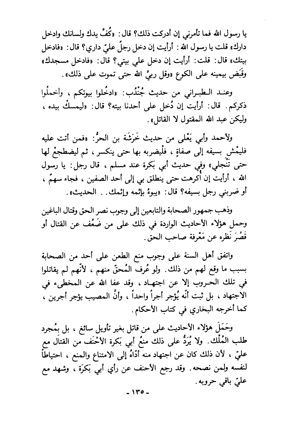 وذهب جمهور الصحابة والتابعين إلى وجوب نصر الحق وقتال الباغين وحمل هؤلاء الأحاديث الواردة في ذلك على من ضَعُف عن القتال أو قَصُرَ نَظره عن مَعْرفة صاحب الحق.