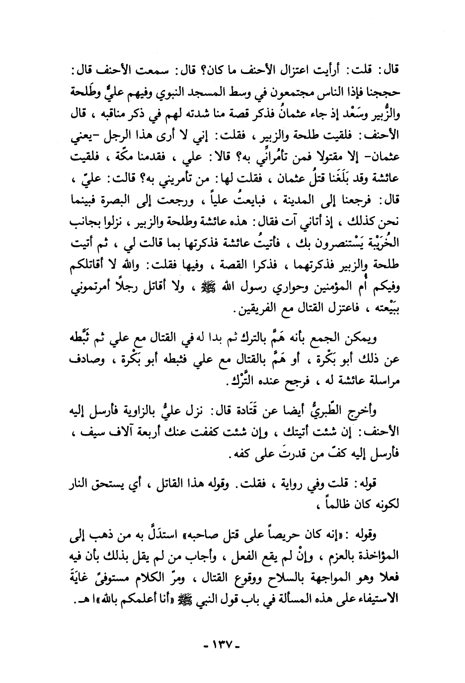 قال: قلت: أرأيت اعتزال الأحنف ما كان؟ قال: سمعت الأحنف قال: حججنا فإذا الناس مجتمعون في وسط المسجد النبوي وفيهم عليٌّ وطَلحة والزُّبير وسَعْد إذ جاء عثمانُ فذكر قصة منا شدته لهم في ذكر مناقبه، قال الأحنف: فلقيت طلبة والزبير، فقلت: إني لا أرى هذا الرجل -يعني عثمان- إلا مقتولا فمن تأمُرانِّي به؟ قالا: علي، فقدمنا مكّة، فلقيت عائشة وقد بَلَغَنا قتلُ عثمان، فقلت لها: من تأمريني به؟ قالت: عليّ، قال: فرجعنا إلى المدينة، فبايعتُ عليًا، ورجعت إلى البصرة فبينما نحن كذلك، إذ أتاني آت فقال: هذه عائشة وطلحة والزبير، نزلوا بجانب الخُرَيْبة يَسْتنصرون بك، فأتيتُ عائشة فذكرتها بما قالت لي، ثم أتيت طلحة والزبير فذكرتهما، فذكرا القصة، وفيها فقلت: والله لا أقاتلكم وفيكم أُم المؤمنين وحواري رسول الله - صلى الله عليه وسلم -، ولا أقاتل رجلًا أمرتموني ببَيْعته، فاعتزل القتال مع الفريقين.