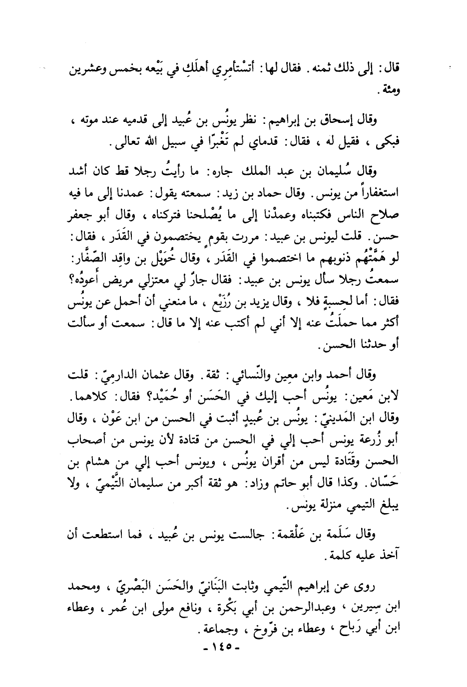 وقال سُليمان بن عبد الملك جاره: ما رأيتُ رجلًا قط كان أشد استغفارًا من يونس. وقال حماد بن زيد: سمعته يقول: عمدنا إلى ما فيه صلاح الناس فكتبناه وعمدْنا إلى ما يُصْلحنا فتركناه، وقال أبو جعفر حسن. قلت ليونس بن عبيد: مررت بقومٍ يختصمون في القَدَر، فقال: لو هَمَّتْهُم ذنوبهم ما اختصموا في القَدَر، وقال خُوَيْل بن واقِد الصّفَّار: سمعتُ رجلًا سأل يونس بن عبيد: فقال جارٌ لي معتزلي مريض أَعودُه؟ فقال: أما لحِسبةٍ فلا، وقال يزيد بن رُزَيْع، ما منعني أن أحمل عن يونُس أكثر مما حملَتُ عنه إلا أني لم أكتب عنه إلا ما قال: سمعت أو سألت أو حدثنا الحسن.