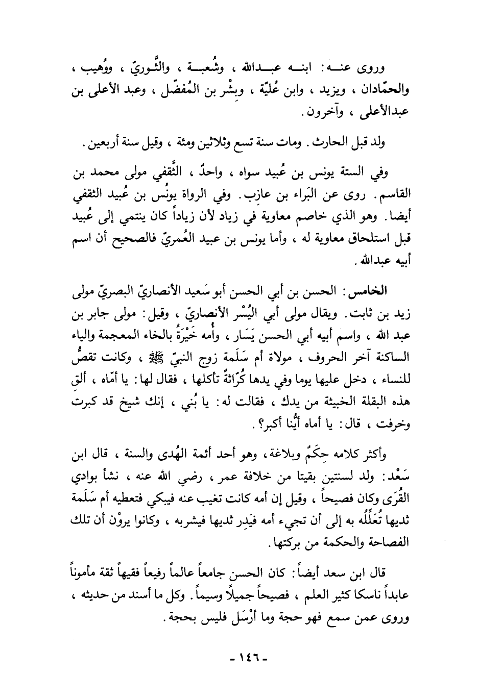 الخامس: الحسن بن أبي الحسن أبو سَعيد الأنصاريّ البصريّ مولى زيد بن ثابت. ويقال مولى أبي اليُسْر الأنصاريّ، وقيل: مولى جابر بن عبد الله، واسم أبيه أبي الحسن يَسَار، وأُمه خَيْرَةُ بالخاء المعجمة والياء الساكنة آخر الحروف، مولاة أم سَلَمة زوج النبيّ - صلى الله عليه وسلم -، وكانت تقصُّ للنساء، دخل عليها يوما وفي يدها كُرّاثةٌ تأكلها، فقال لها: يا أمّاه، ألقِ هذه البقلة الخبيثة من يدك، فقالت له: يا بُني، إنك شيخ قد كبرت وخرفت، قال: يا أماه أيُنا أكبر؟.