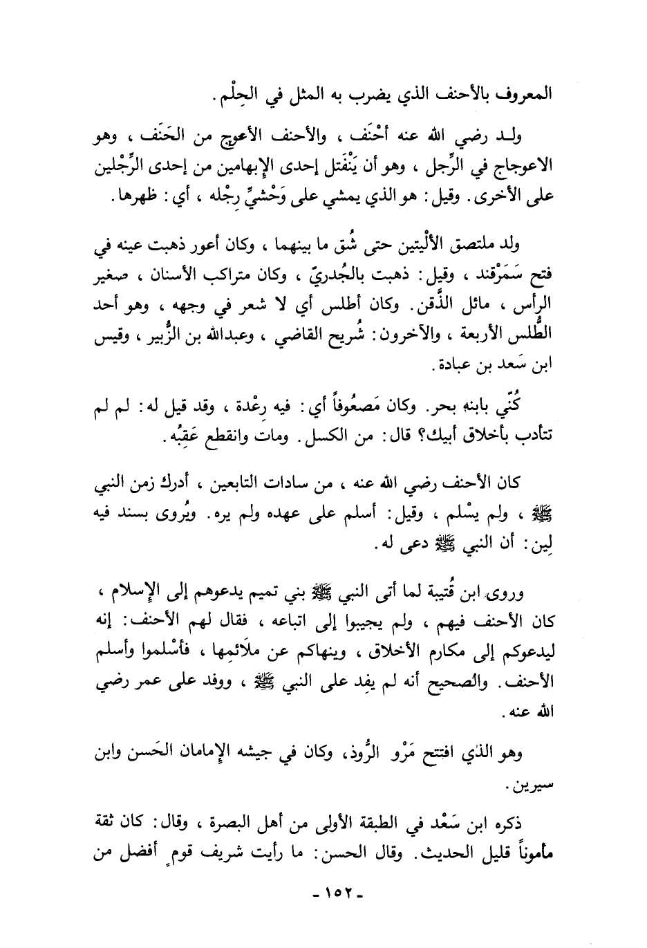 كان الأحنف - رضي الله عنه -، من سادات التابعين، أدرك زمن النبي - صلى الله عليه وسلم -، ولم يسْلم، وقيل: أسلم على عهده ولم يره. ويُروى بسند فيه لِين: أن النبي - صلى الله عليه وسلم - دعى له.