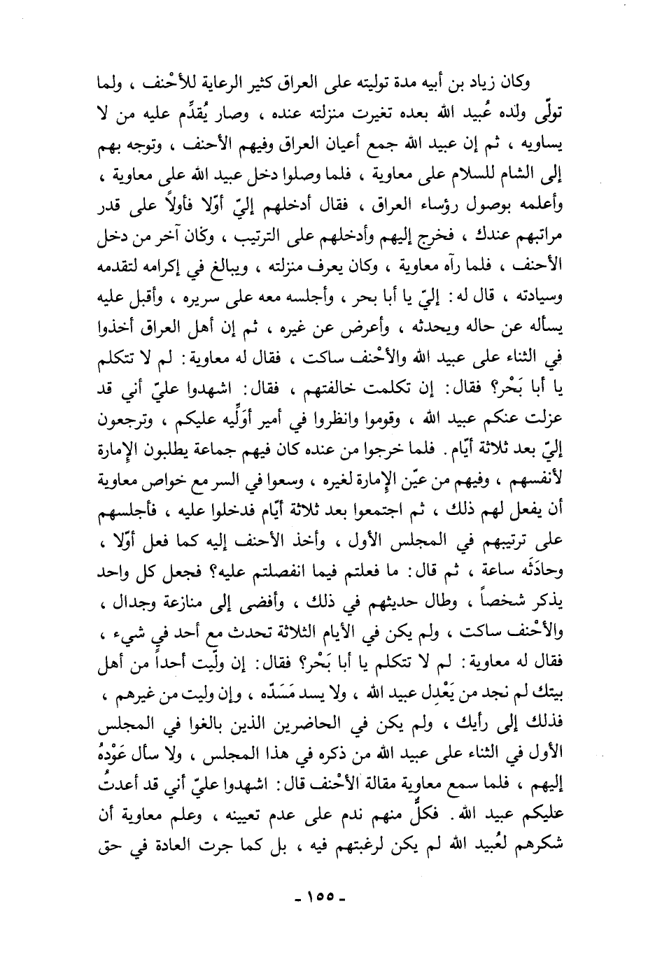 وكان زياد بن أبيه مدة توليته على العراق كثير الرعاية للأحْنف، ولما تولّى ولده عُبيد الله بعده تغيرت منزلته عنده، وصار يُقدِّم عليه من لا يساويه، ثم إن عبيد الله جمع أعيان العراق وفيهم الأحنف، وتوجه بهم إلى الشام للسلام على معاوية، فلما وصلوا دخل عبيد الله على معاوية، وأعلمه بوصول رؤساء العراق، فقال أدخلهم إليّ أوّلًا فأولًا على قدر مراتبهم عندك، فخرج إليهم وأدخلهم على الترتيب، وكان آخر من دخل الأحنف، فلما رآه معاوية، وكان يعرف منزلته، ويبالغ في إكرامه لتقدمه وسيادته، قال له: إليّ يا أبا بحر، وأجلسه معه على سريره، وأقبل عليه يسأله عن حاله ويحدثه، وأعرض عن غيره، ثم إن أهل العراق أخذوا في الثناء على عبيد الله والأحْنف ساكت، فقال له معاوية: لم لا تتكلم يا أبا بَحْر؟ فقال: إن تكلمت خالفتهم، فقال: اشهدوا عليّ أني قد عزلت عنكم عبيد الله، وقوموا وانظروا في أمير أوَلِّيه عليكم، وترجعون إليّ بعد ثلاثة أيّام. فلما خرجوا من عنده كان فيهم جماعة يطلبون الإِمارة لأنفسهم، وفيهم من عيّن الإِمارة لغيره، وسعوا في السر مع خواص معاوية أن يفعل لهم ذلك، ثم اجتمعوا بعد ثلاثة أيّام فدخلوا عليه، فأجلسهم على ترتيبهم في المجلس الأول، وأخذ الأحنف إليه كما فعل أوّلا، وحادَثَه ساعة، ثم قال: ما فعلتم فيما انفصلتم عليه؟ فجعل كل واحد يذكر شخصًا، وطال حديثهم في ذلك، وأفضى إلى منازعة وجدال، والأحْنف ساكت، ولم يكن في الأيام الثلاثة تحدث مع أحد في شيء، فقال له معاوية: لم لا تتكلم يا أبا بَحْر؟ فقال: إن ولّيت أحدًا من أهل بيتك لم نجد من يَعْدِل عبيد الله، ولا يسد مَسَدّه، وإن وليت من غيرهم، فذلك إلى رأيك، ولم يكن في الحاضرين الذين بالغوا في المجلس الأول في الثناء على عبيد الله من ذكره في هذا المجلس، ولا سأل عَوْدهُ إليهم، فلما سمع معاوية مقالة الأحْنف قال: اشهدوا عليّ أني قد أعدتُ عليكم عبيد الله. فكلٌّ منهم ندم على عدم تعيينه، وعلم معاوية أن شكرهم لعُبيد الله لم يكن لرغبتهم فيه، بل كما جرت العادة في حق