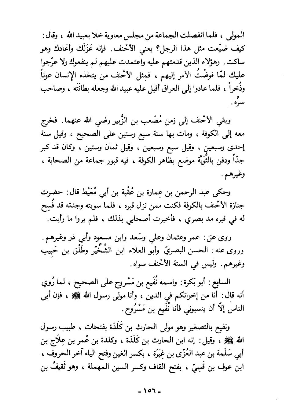 وبقي الأحْنف إلى زمن مُصْعب بن الزُّبير - رضي الله عنهما -. فخرج معه إلى الكوفة، ومات بها سنة سبع وستين على الصحيح، وقيل سنة إحدى وسبعين، وقيل سبع وسبعين، وقيل ثمان وستين، وكان قد كبر جدًّا ودفن بالثُّوَيَّة موضع بظاهر الكوفة، فيه قبور جماعة من الصحابة، وغيرهم.