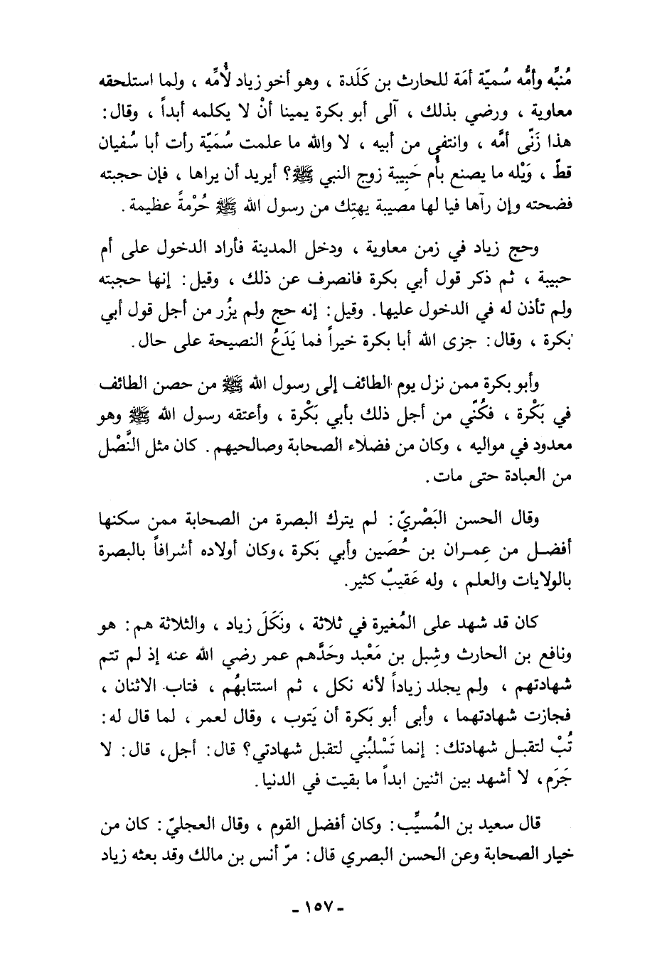 كان قد شهد على المُغيرة في ثلاثة، ونَكَلَ زياد، والثلاثة هم: هو ونافع بن الحارث وشِبل بن مَعْبد وحَدَّهم عمر - رضي الله عنه - إذ لم تتم شهادتهم، ولم يجلد زيادًا لأنه نكل، ثم استتابهُم، فتاب الاثنان، فجازت شهادتهما، وأبى أبو بَكرة أن يَتوب، وقال لعمر، لما قال له: تُبْ لتقبل شهادتك: إنما تَسْلبُني لتقبل شهادتي؟ قال: أجل، قال: لا جَرَم، لا أشهد بين اثنين ابدًا ما بقيت في الدنيا.