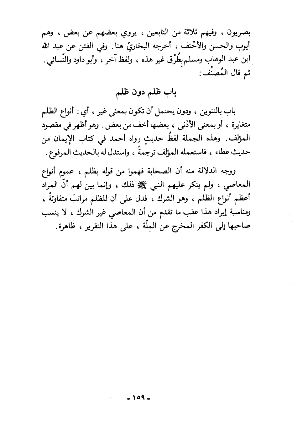 ووجه الدلالة منه أن الصحابة فهموا من قوله بظلم، عموم أنواع المعاصي، ولم ينكر عليهم النبي - صلى الله عليه وسلم - ذلك، وإنما بين لهم أنّ المراد أعظم أنواع الظلم، وهو الشرك، فدل على أن للظلم مراتبَ متفاوتةً، ومناسبة إيراد هذا عقب ما تقدم من أن المعاصي غير الشرك، لا ينسب صاحبها إلى الكفر المخرج عن المِلّة، على هذا التقرير، ظاهرة.