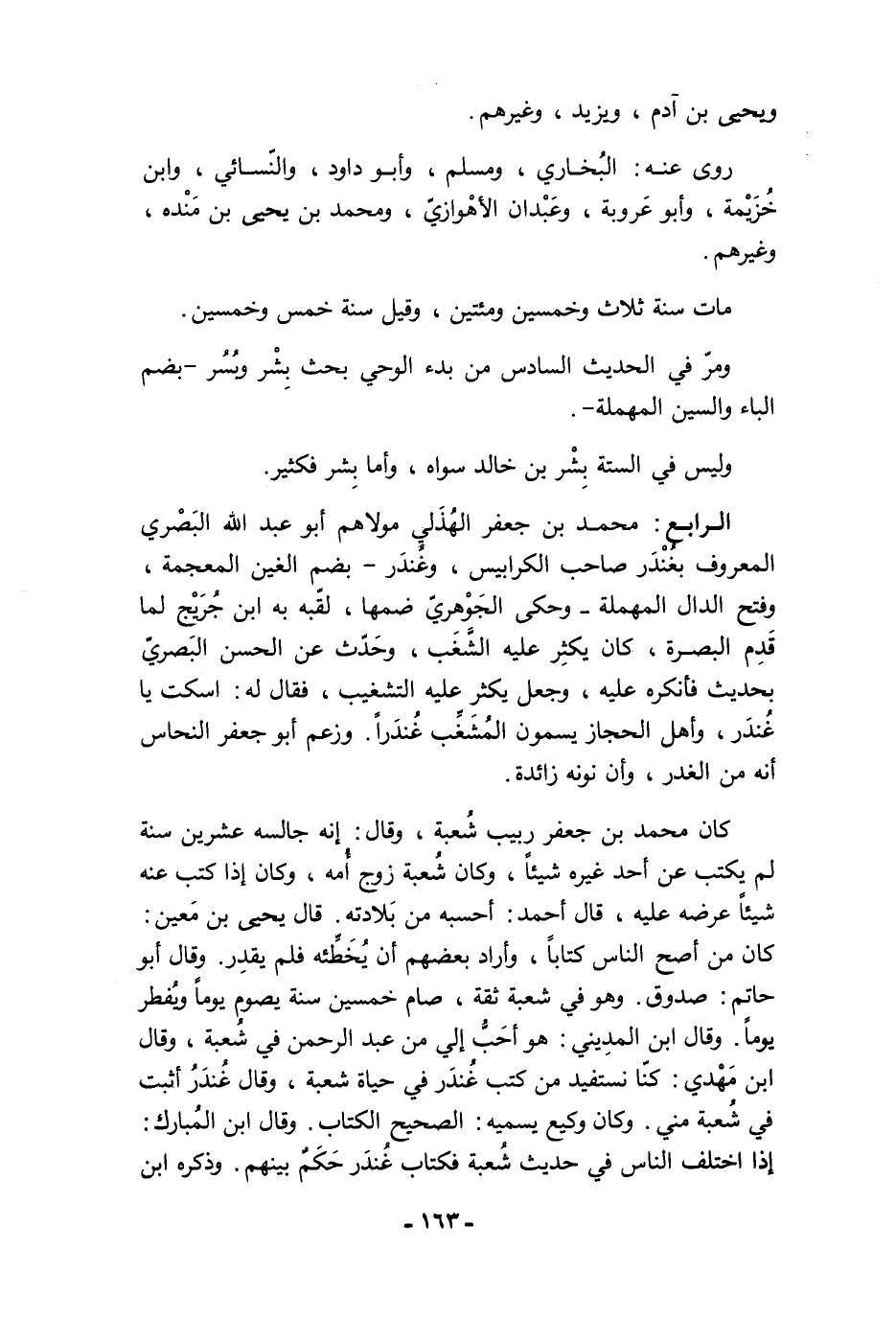 الرابع: محمَّد بن جعفر الهُذَلي مولاهم أبو عبد الله البَصْري المعروف بغُنْدَر صاحب الكرابيس، وغُندَر -بضم الغين المعجمة، وفتح الدال المهملة- وحكى الجَوْهريّ ضمها، لقّبه به ابن جُرَيْج لما قَدِم البصرة، كان يكثِر عليه الشَّغَب، وحَدّث عن الحسن البَصريّ بحديث فأنكره عليه، وجعل يكثر عليه التشغيب، فقال له: اسكت يا غُندَر، وأهل الحجاز يسمون المُشَغِّب غُندَرًا. وزعم أبو جعفر النحاس أنه من الغدر، وأن نونه زائدة.