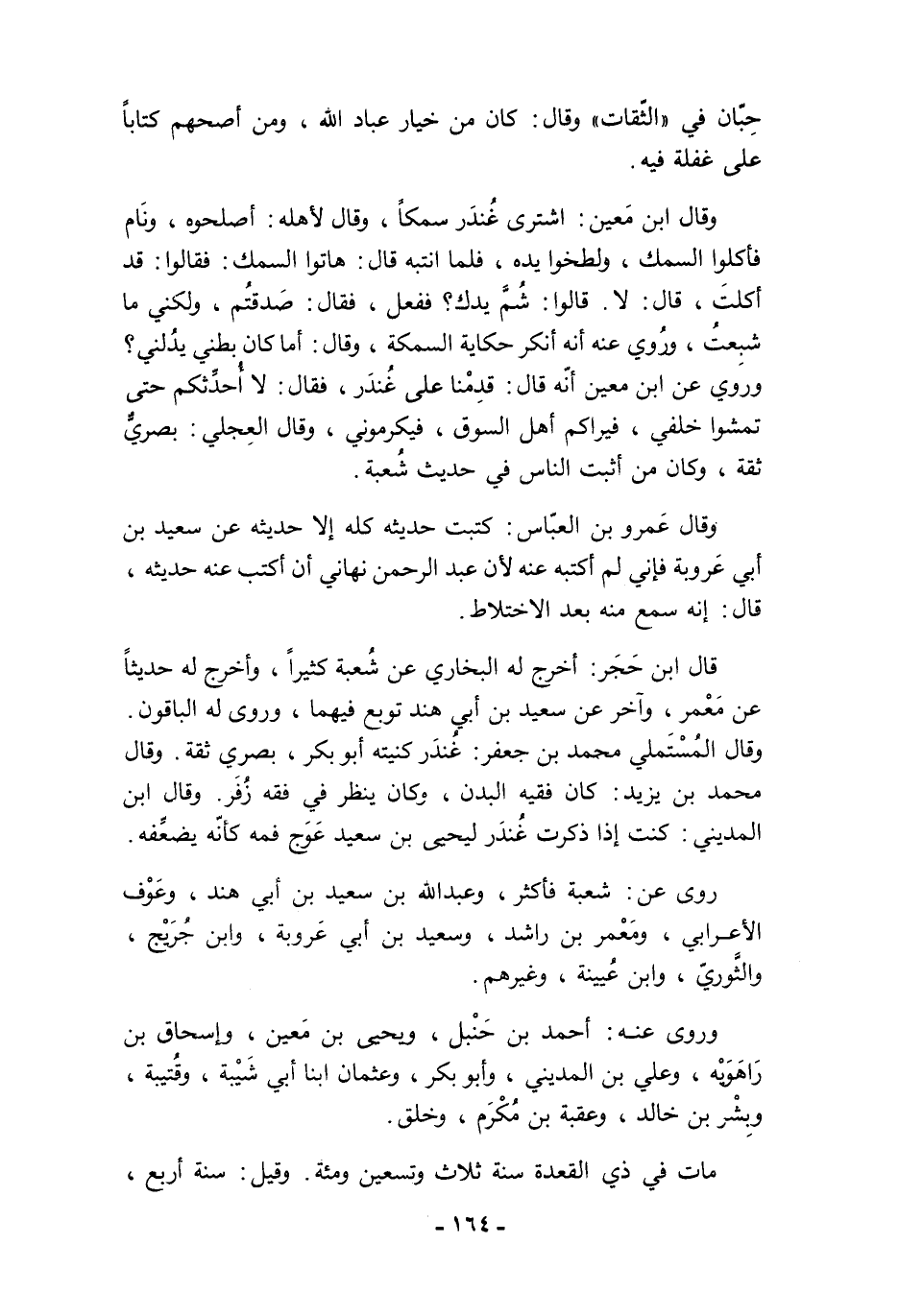 وقال ابن مَعين: اشترى غُندَر سمكًا، وقال لأهله: أصلحوه، ونَام فأكلوا السمك، ولطخوا يده، فلما انتبه قال: هاتوا السمك: فقالوا: قد أكلتَ، قال: لا. قالوا: شُمَّ يدك؟ ففعل، فقال: صَدقتُم، ولكَني ما شبِعتُ، ورُوي عنه أنه أنكر حكاية السمكة، وقال: أما كان بطني يدُلني؟ وروي عن ابن معين أنه قال: قدِمْنا على غُندَر، فقال: لا أُحدِّثكم حتى تمشوا خلفي، فيراكم أهل السوق، فيكرموني، وقال العِجلي: بصريٌّ ثقة، وكان من أثبت الناس في حديث شُعبة.